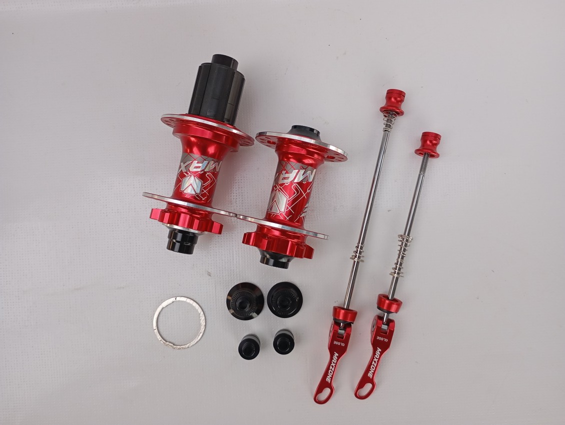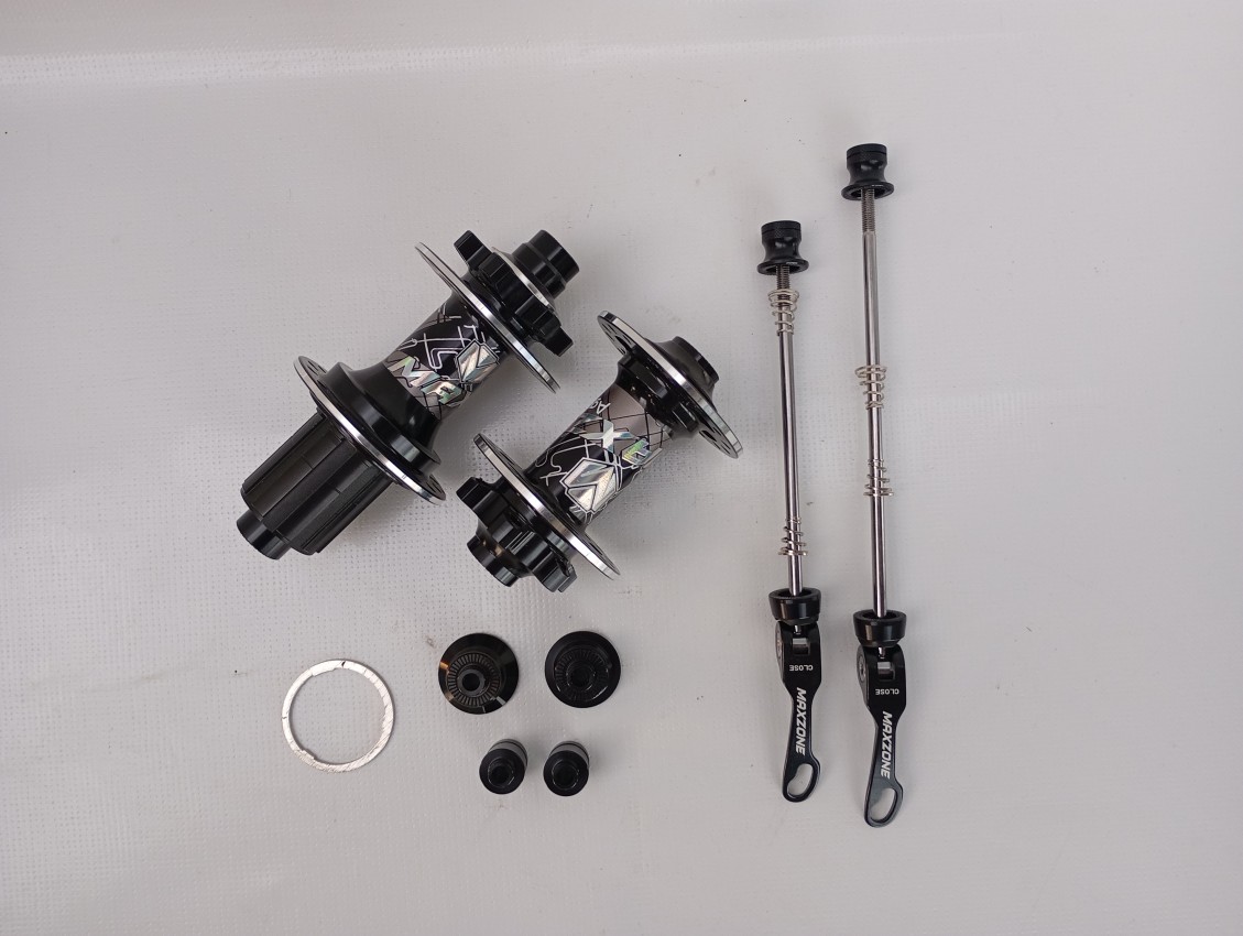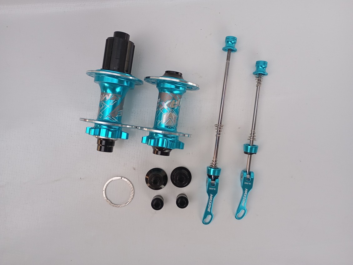Brand new Maxzone Aggressor 32 holes  through axle hub set. With through axle to quick release adaptor and skewers which also makes it QR compatible. The hub is also disk brake compatible and works with 6 bolt rotors. Compatible with 10-12 speed cassettes.