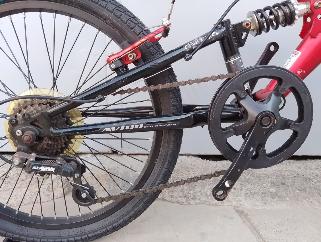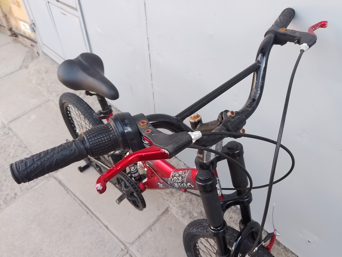 High quality used mountain bike. Wheel size 20. Frame material steel. Gear system 1x7 speed with grip shift. Cog type freewheel. Other features: Dual suspension with steel suspension fork. Suitable for ages 6-11 years.