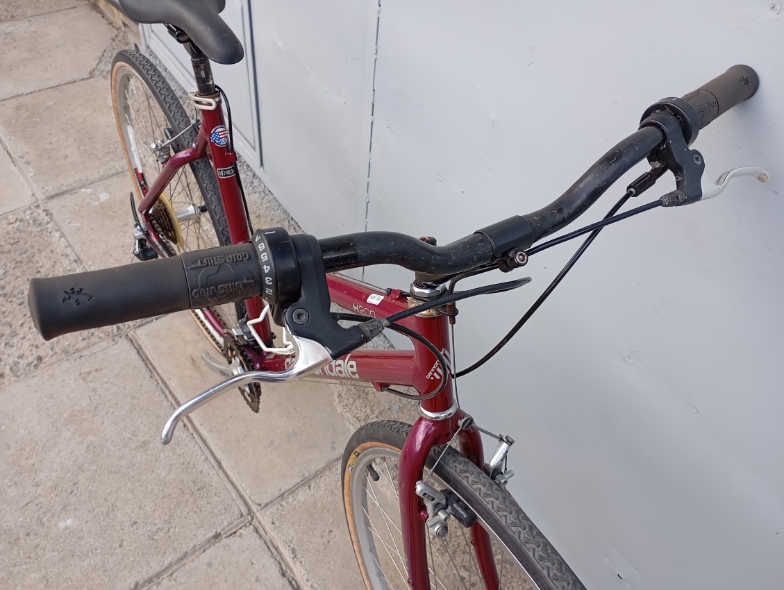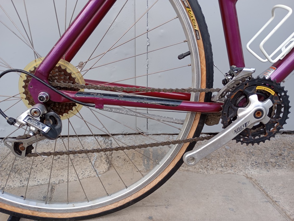 High quality used hybrid bike. Wheel size 700c. Frame material Aluminium with steel fork. Top tube 22', seat tube height 20'. Gear system 3x7 with grip shift . Cog type casette. Other features: sealed BB all wheels have quick release.
