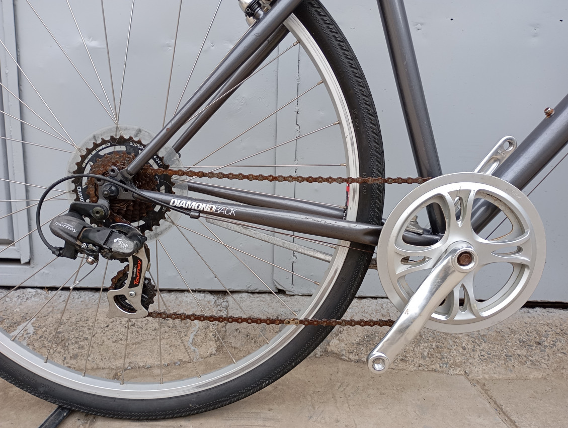High quality used hybrid bike. Wheel size 700c. Frame material steel with steel fork. Top tube 23', seat tube height 19'. Gear system 1x7 with grip shift . Cog type freewheel. Other features: all wheels have quick release.