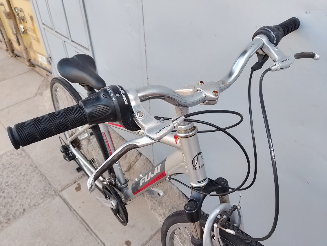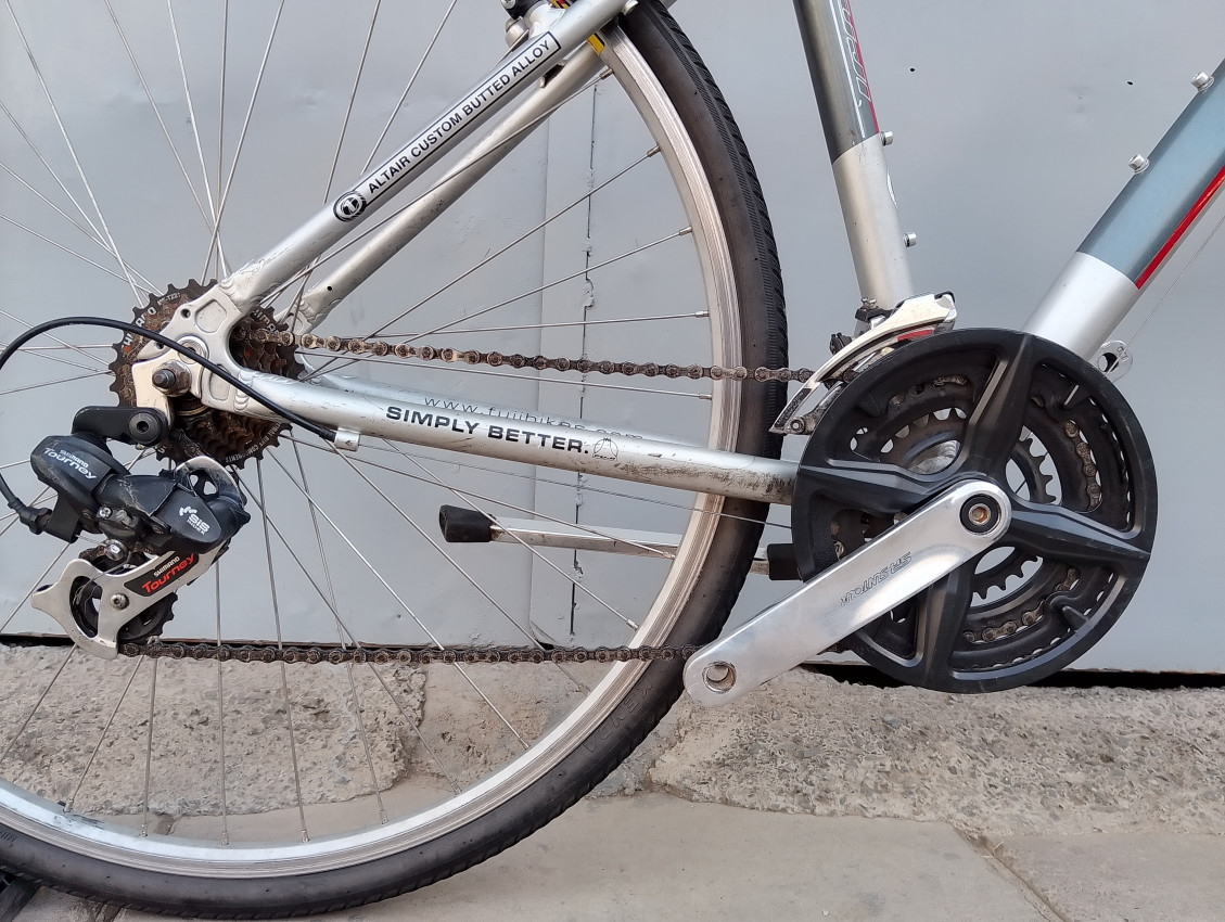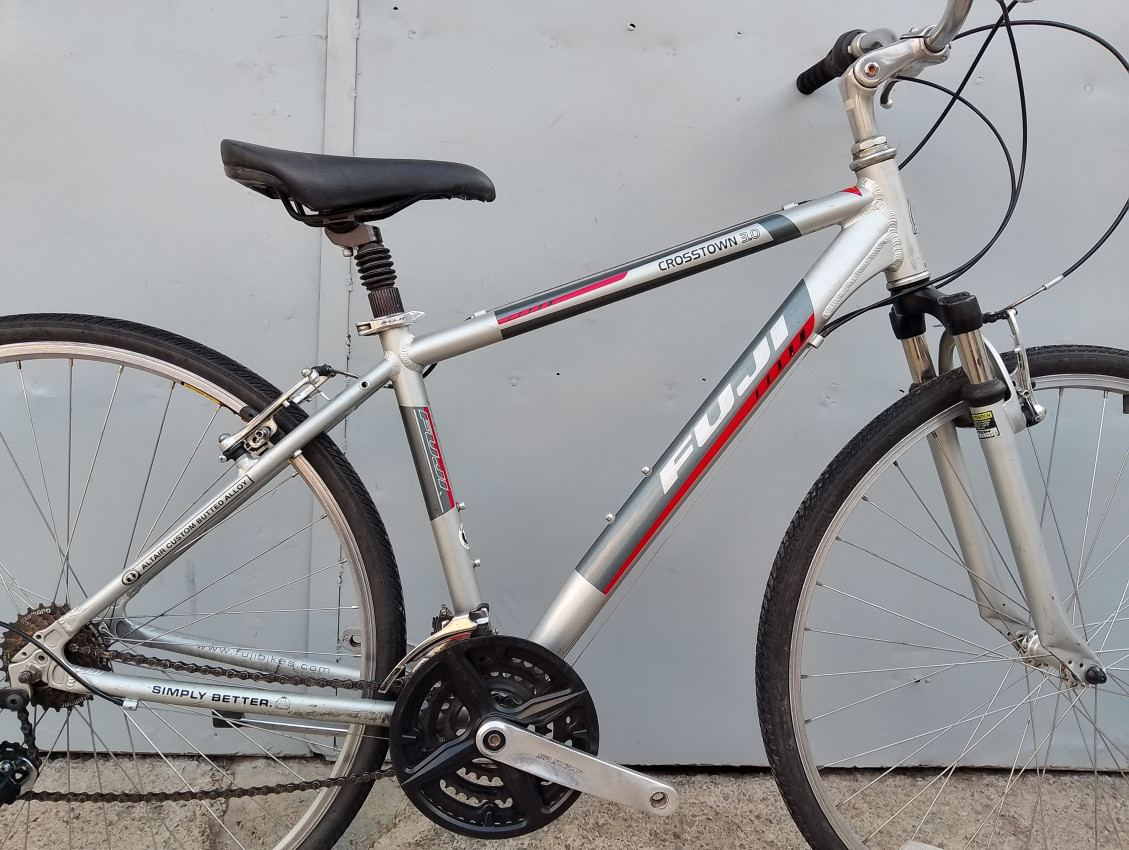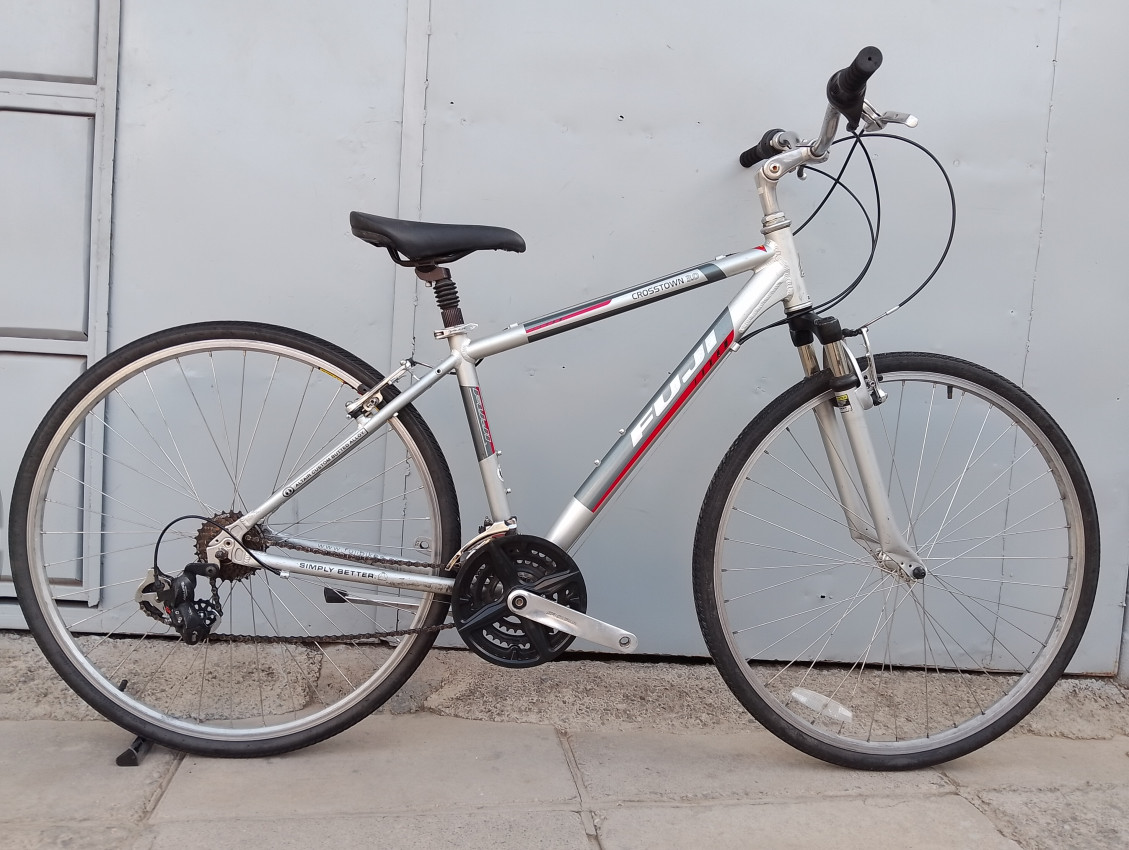 High quality used hybrid bike. Wheel size 700c. Frame material Aluminium with alloy fork. Top tube 21', seat tube height 17.5'. Gear system 3x7 with grip shifts. Cog type freewheel. Other features: sealed BB all wheels have quick release & front alloy suspension fork.