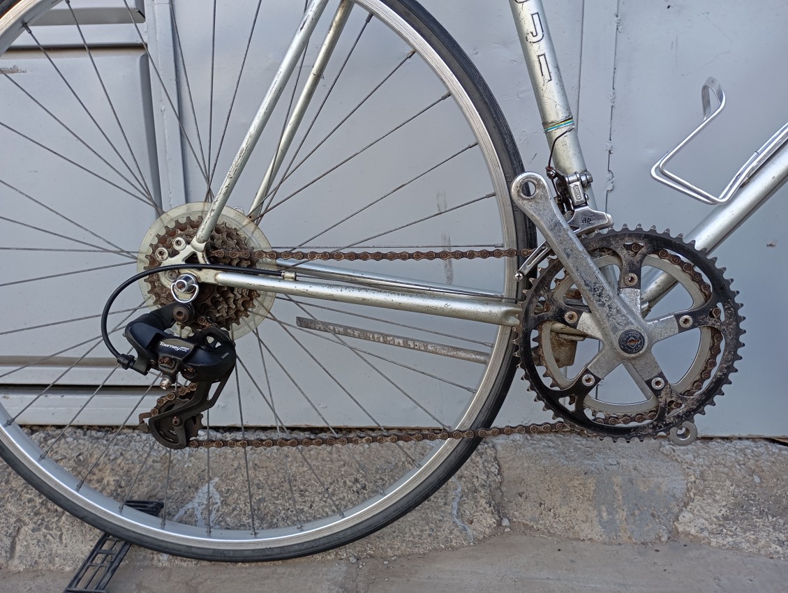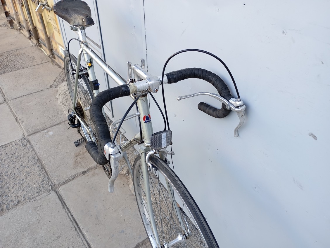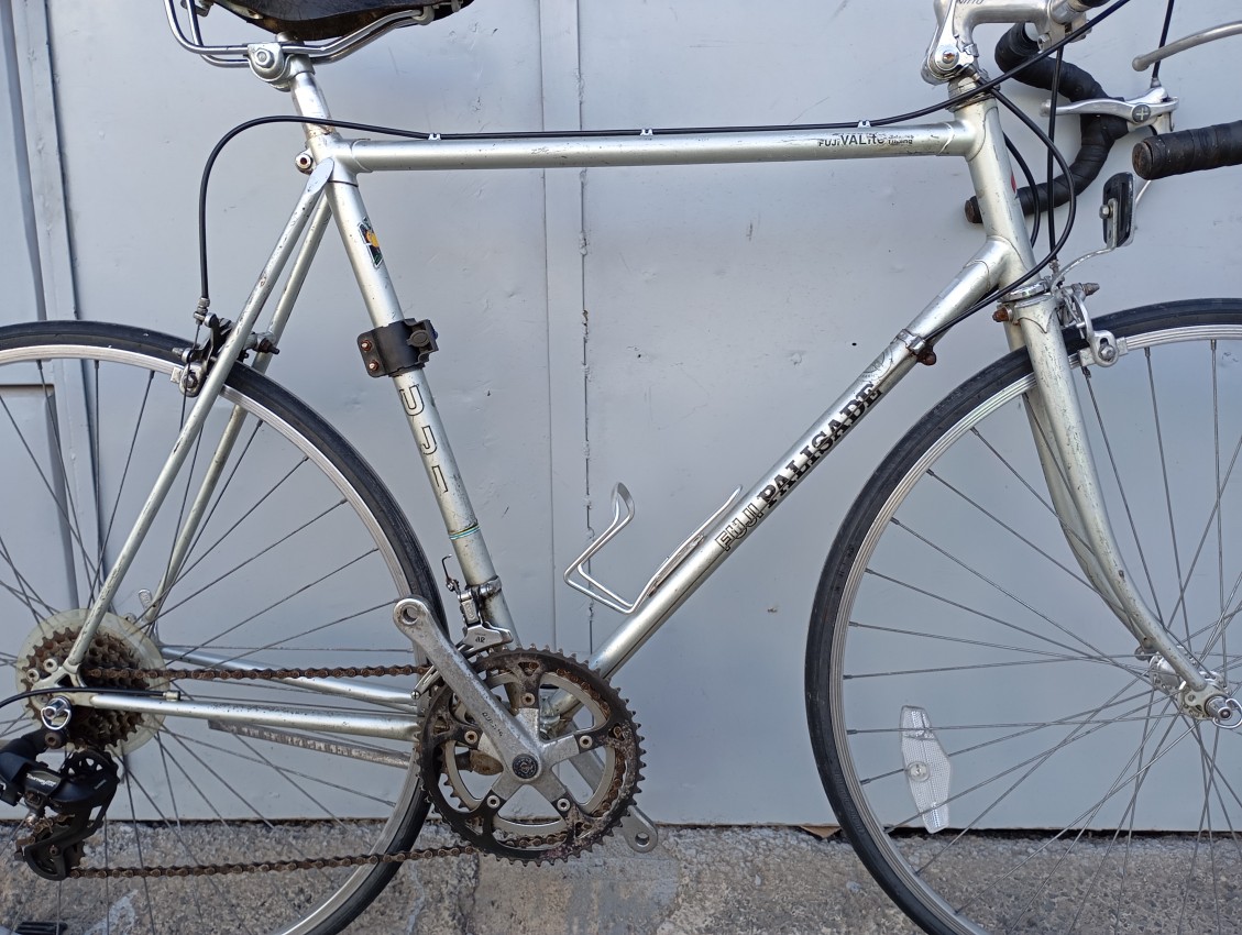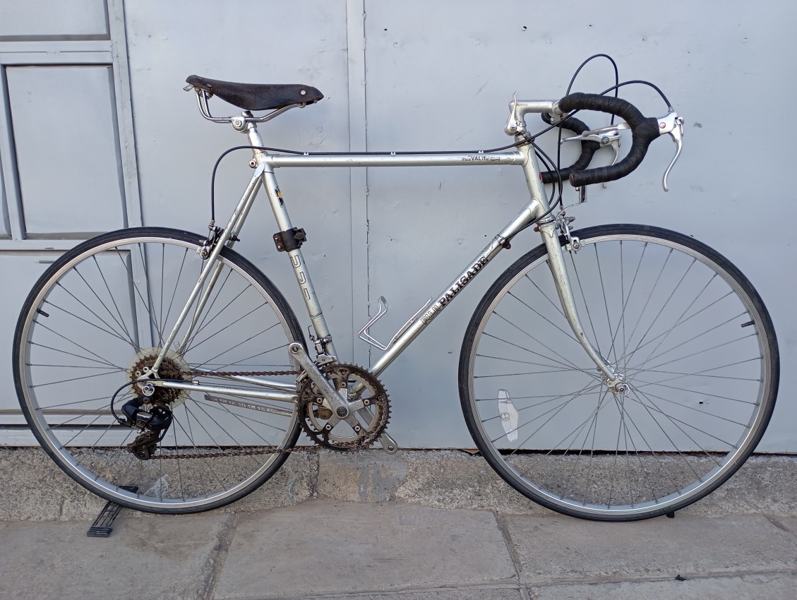 A High quality used vintage race bike. Wheel size 27 1 1/4. Frame material steel. Top tube 55cm, seat tube height 57cm. Gear system 2x6 with thumb shifts. Cog type freewheel. Other features both wheels have quick release axle.