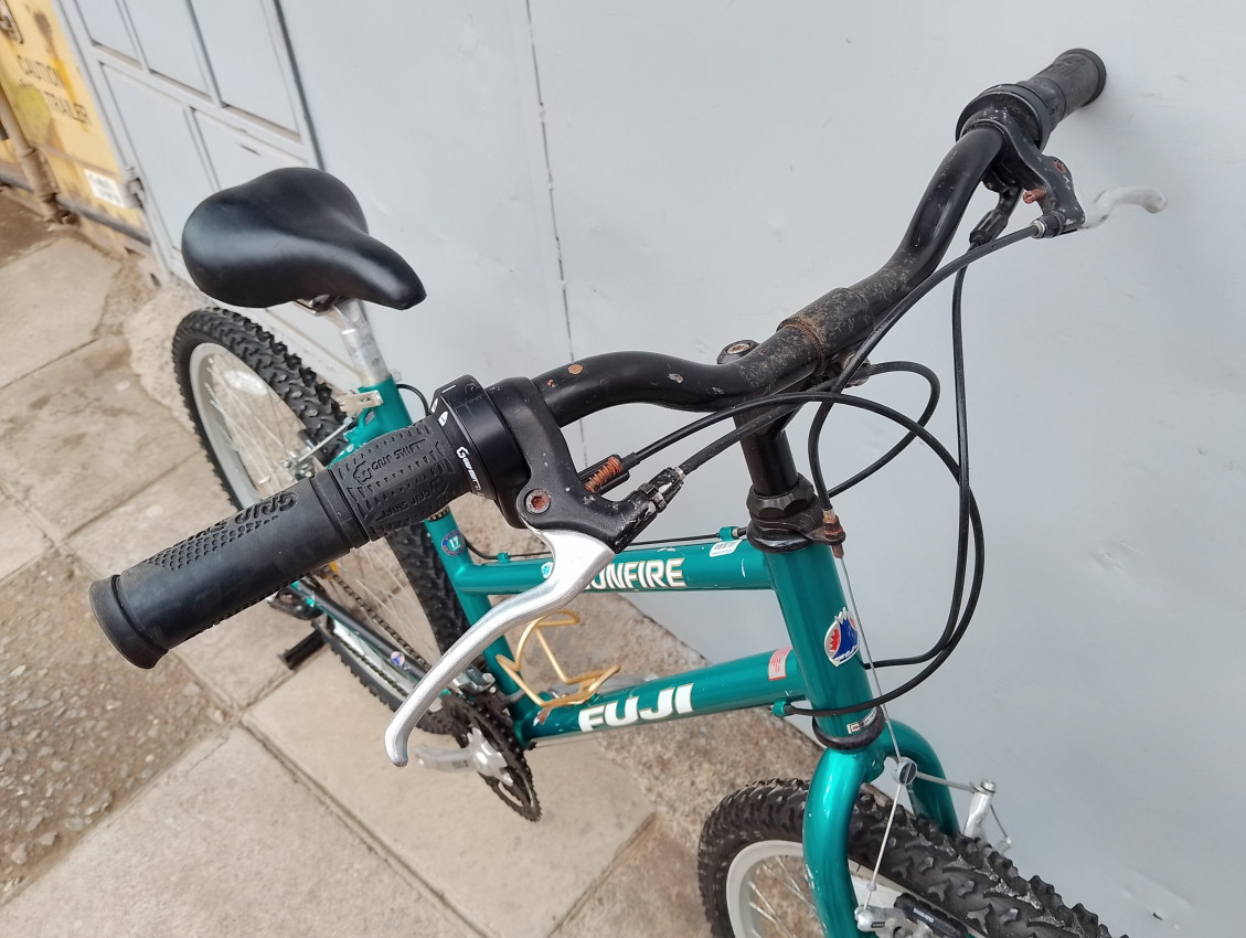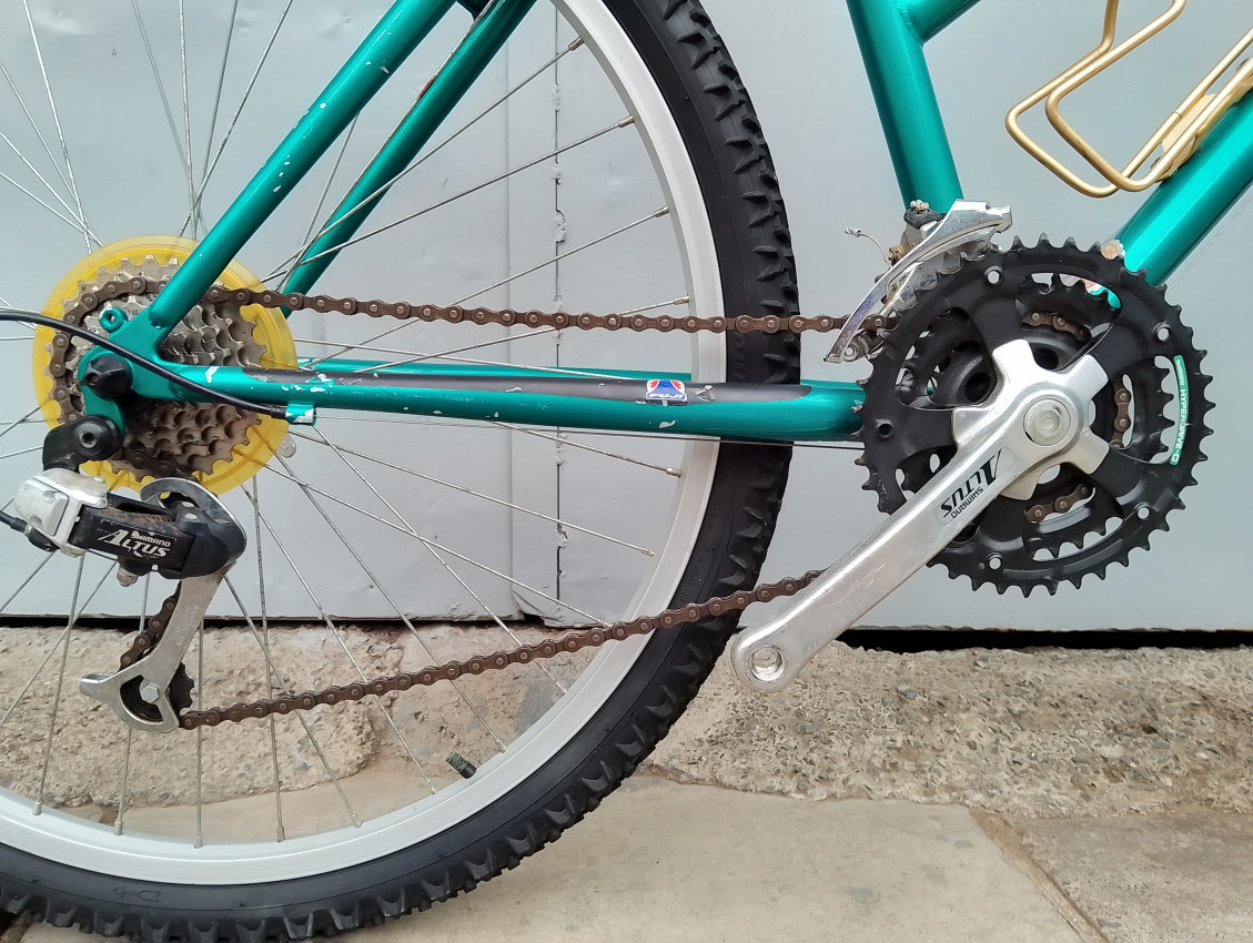 High quality used mountain bike. Wheel size 26. Frame material steel. Top tube19.5', seat tube height 17'. Gear system 3x7 with grip shifts. Cog type cassette. Other features: all wheels have quick release, sealed BB.