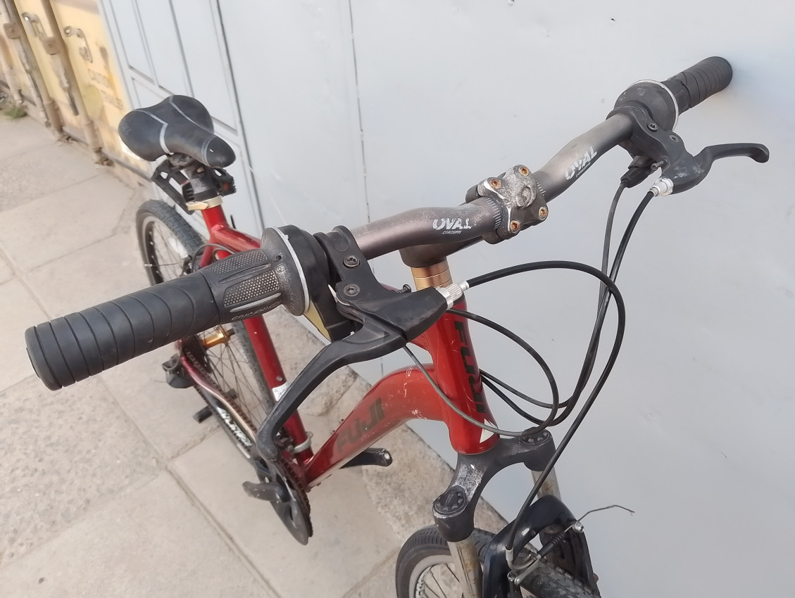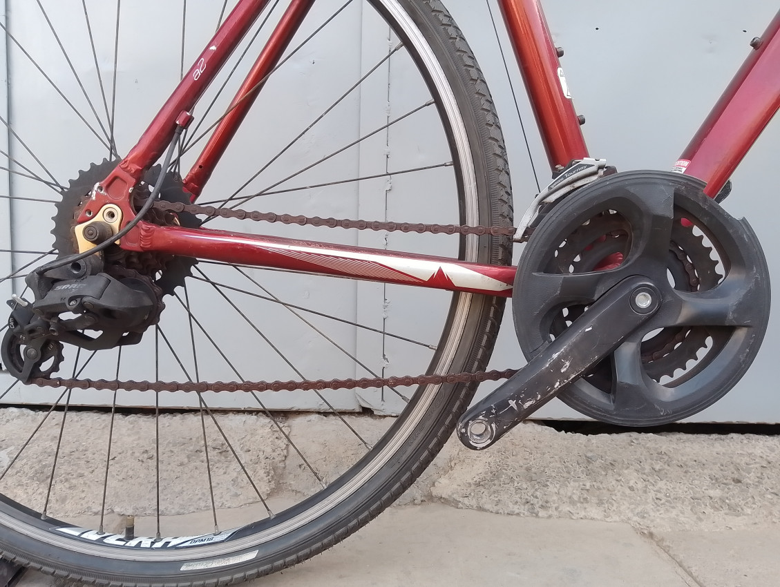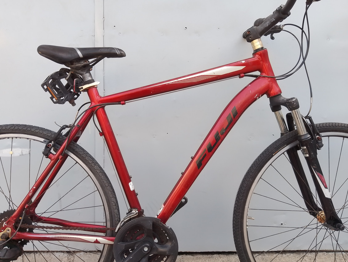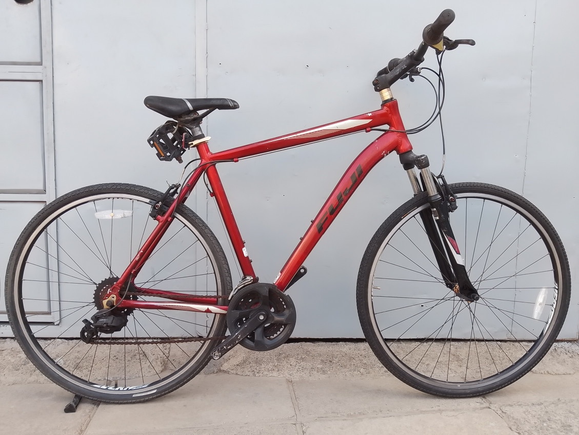 A High quality used hybrid bike. Wheel size 700c. Frame material Aluminium with steel suspension fork. Top tube 23', seat tube height 22'. Gear system 3x7 with grip shifts. Cog type freewheel. Other features: threadless suspension fork, all wheels have quick release. Sealed BB