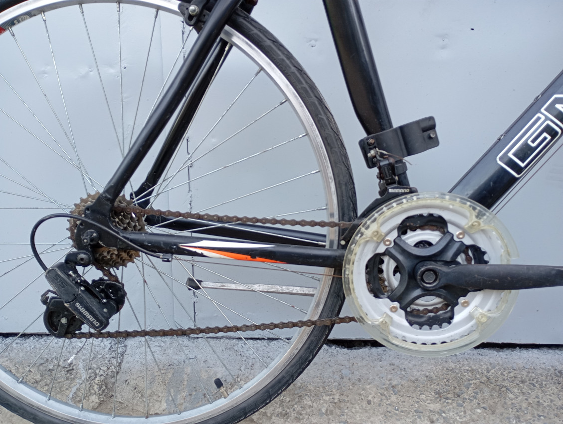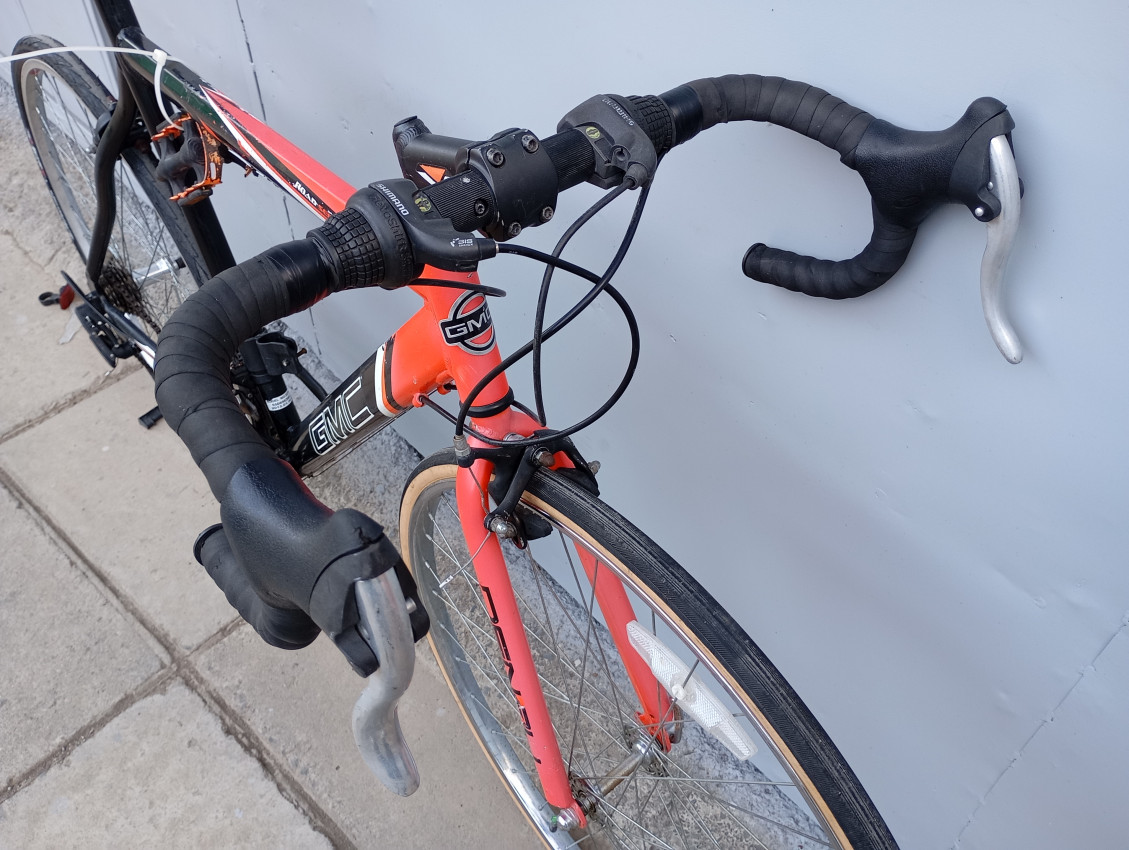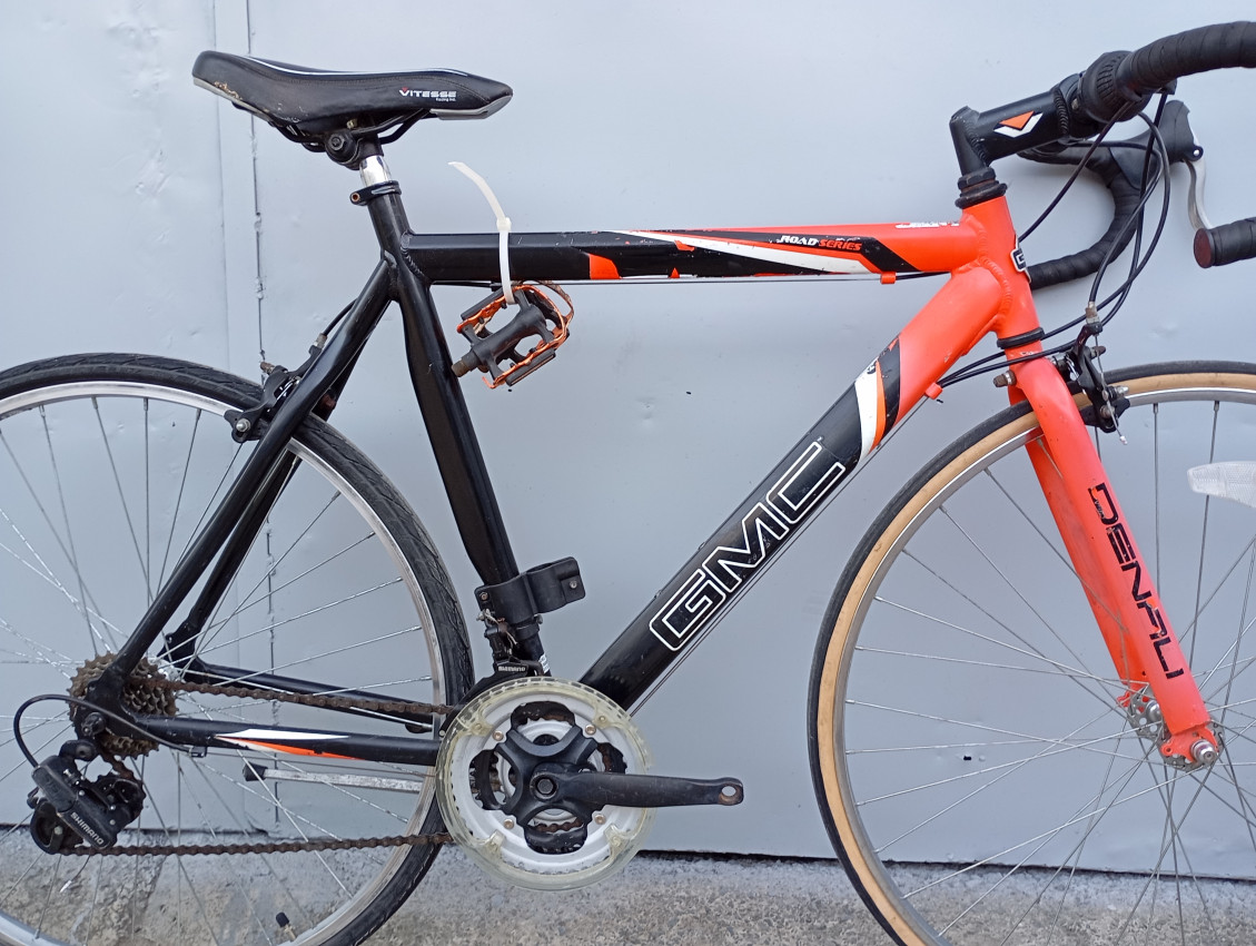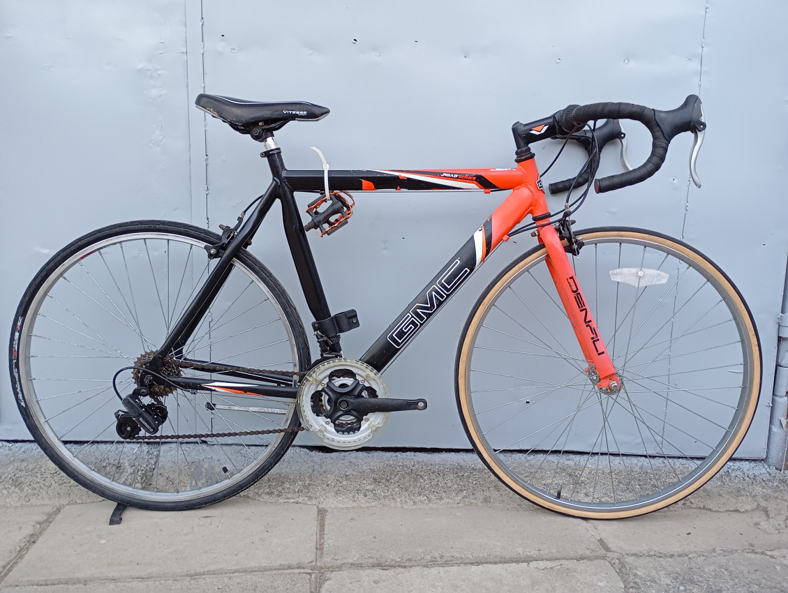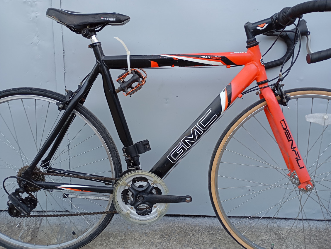 High quality used race bike. Wheel size 700c. Frame material Aluminium with steel fork.Top tube 54.5cm, seat tube height 57cm . Gear system 2x7 with shimano grip shifters. Cog type freewheel.