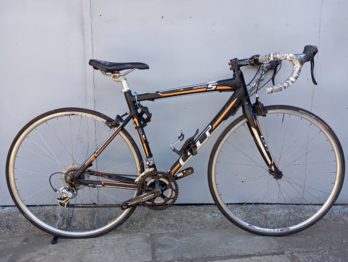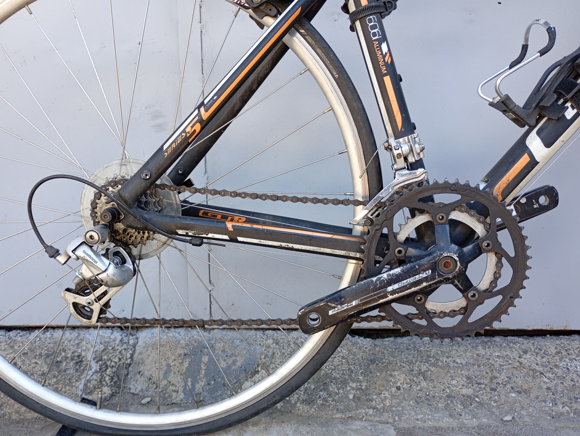 High quality used race bike. Wheel size 700c. Frame material Aluminium with a carbon fork.Top tube 53.5cm, seat tube height 51cm. Gear system 2x8 with shimano STI shifters. Cog type cassette. Other features: sealed BB all wheels have quick release, carbon fork.