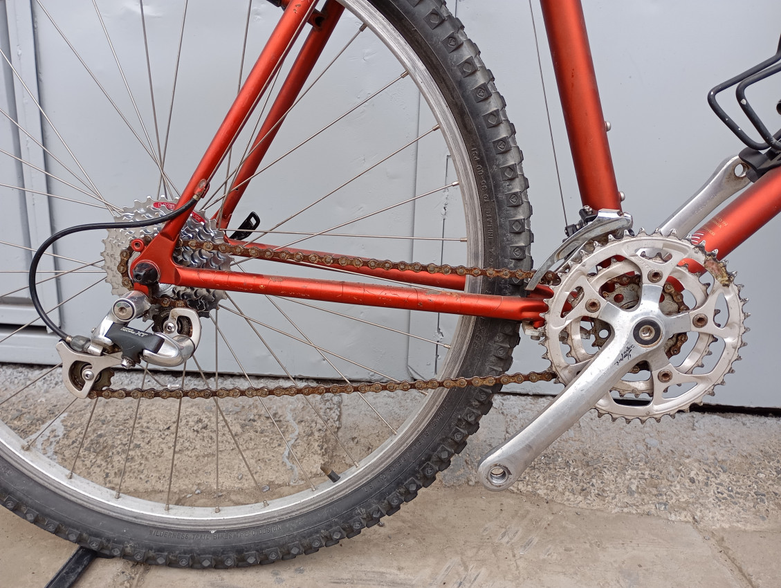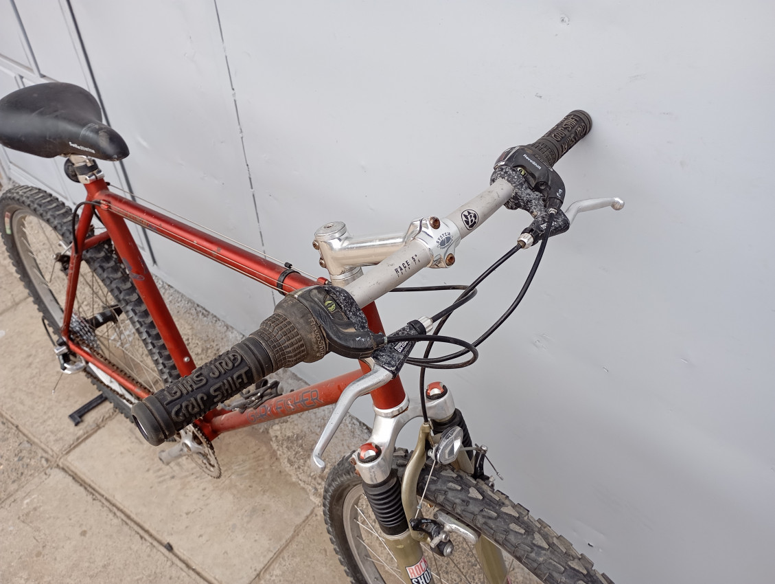 High quality used mountain bike. Wheel size 26. Frame material steel with steel front suspension fork. Top tube 23', seat tube height 21'. Gear system 3x7 with shimano grip shifter. Cog type cassette Other features: all wheels have quick release, threadless steel suspension fork.