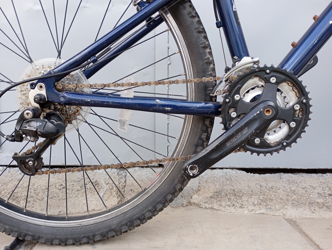 High quality used mountain bike. Wheel size 26. Frame material Aluminium with aluminium front suspension fork. Top tube 21', seat tube height 13'. Gear system 3x8 with shimano trigger shifter. Cog type cassette Other features: sealed BB all wheels have quick release, alloy threadless suspension fork.