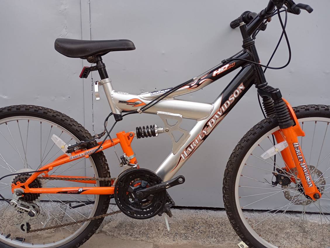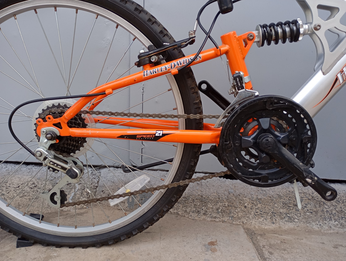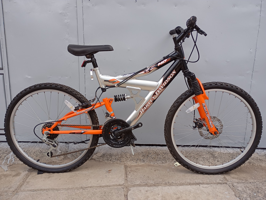 High quality used mountain bike. Wheel size 24 Frame material aluminium. Gear system 3x7 speed with grip shifters. Cog type freewheel. Other features:  dual suspension, front disk brake.