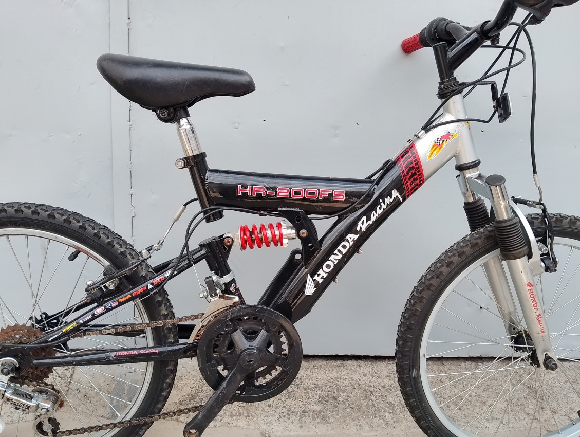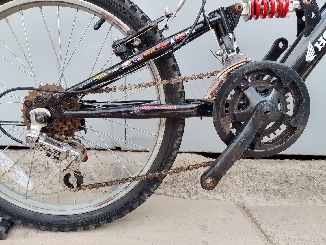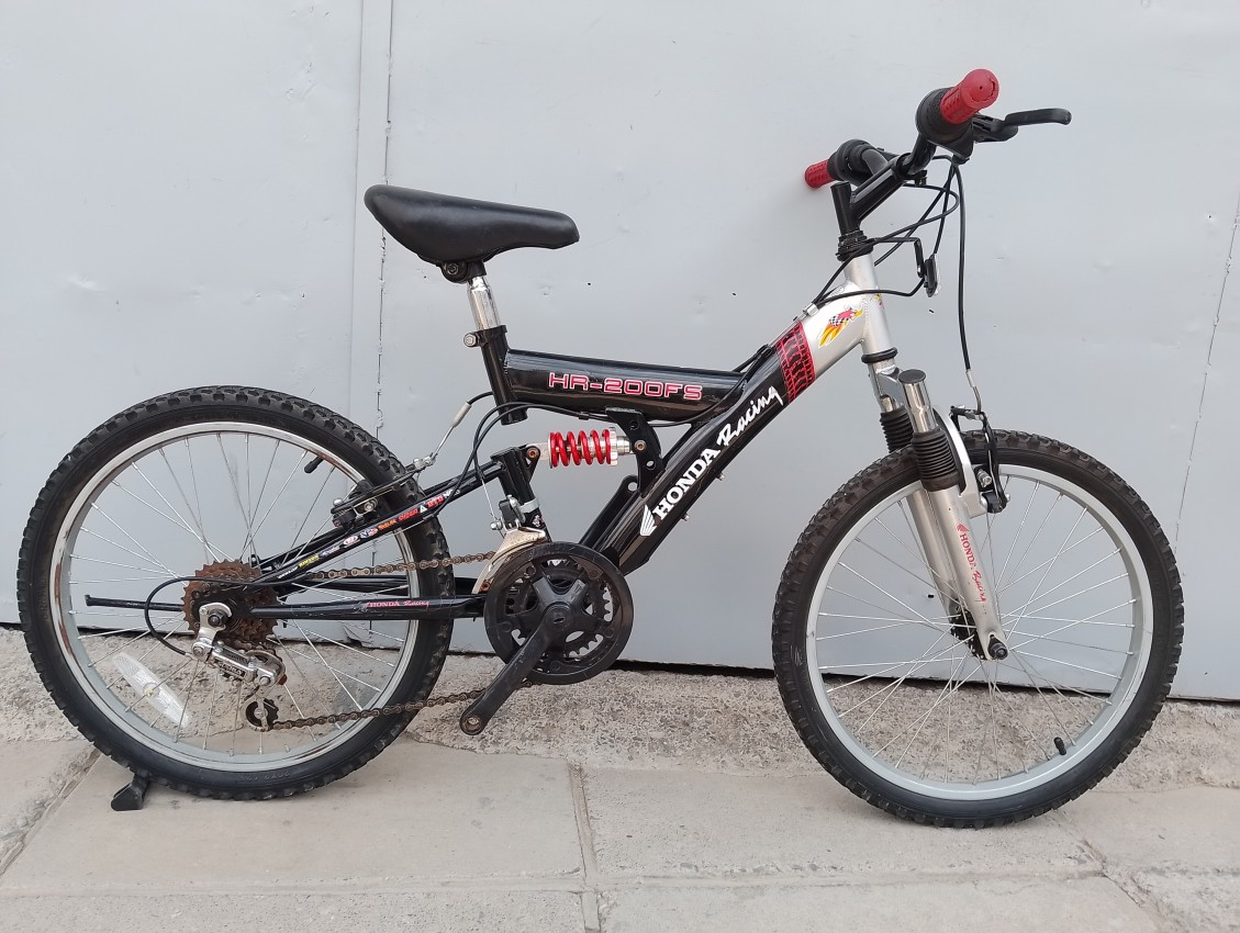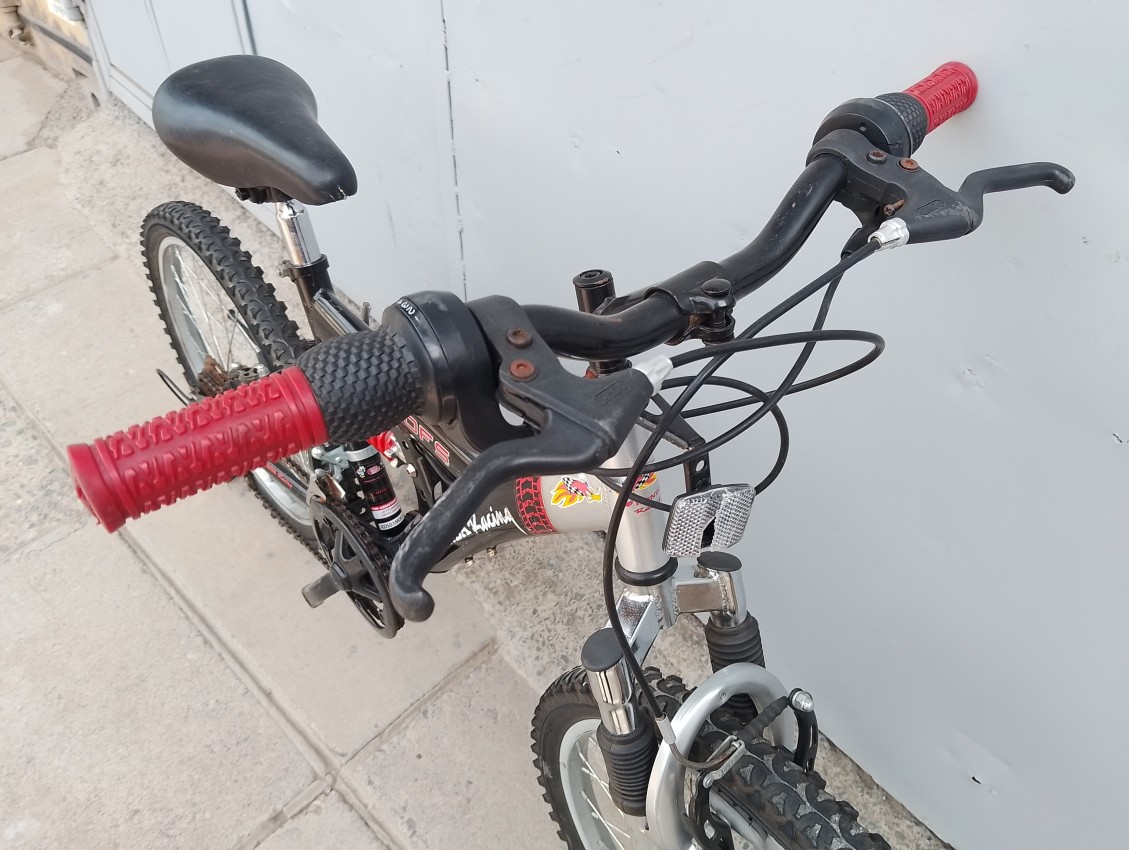 High quality used mountain bike. Wheel size 20. Frame material steel. Gear system 2x5 speed with grip shift. Cog type freewheel. Other features: Dual suspension with steel suspension fork. Suitable for ages 6-11 years.