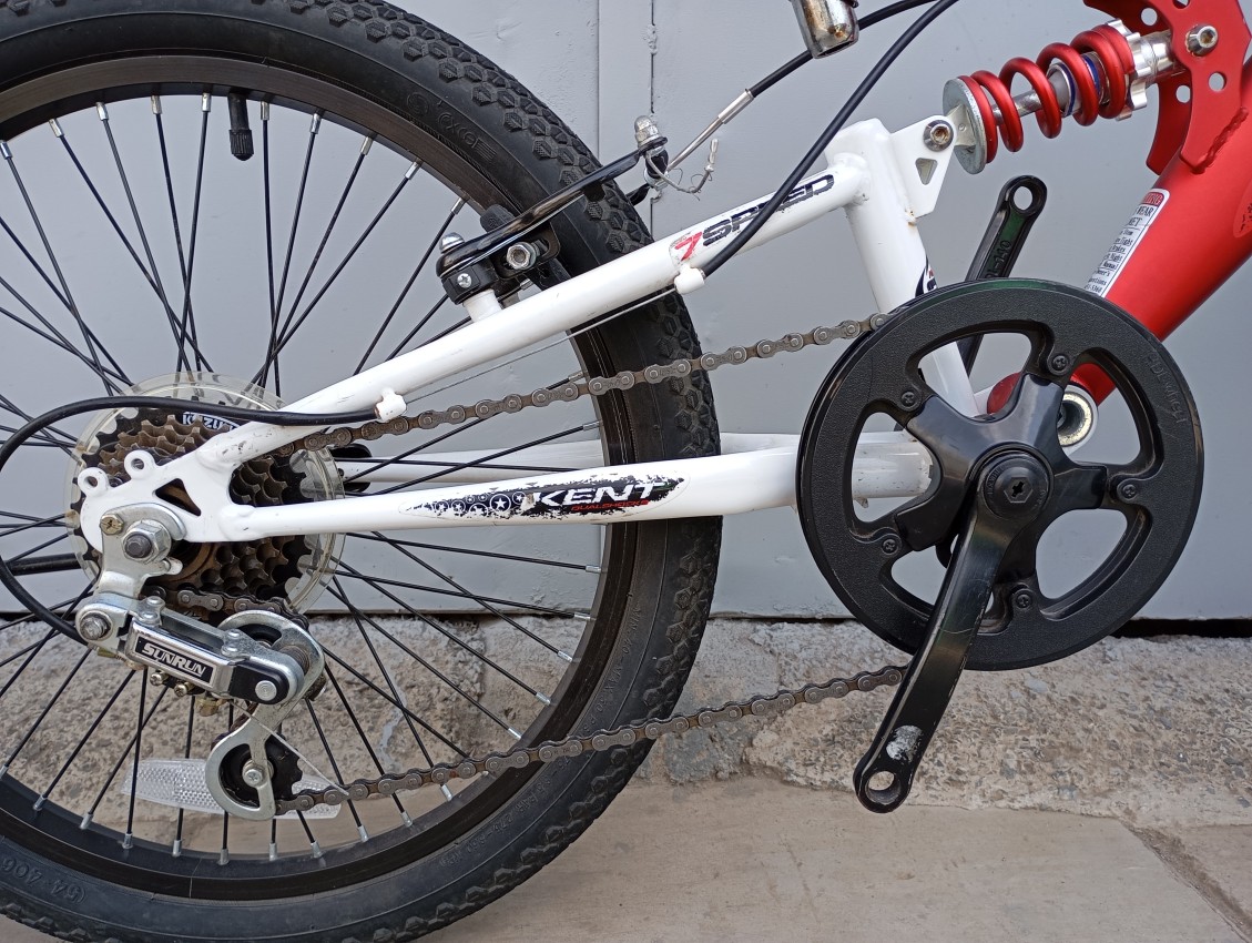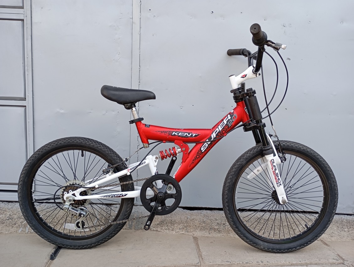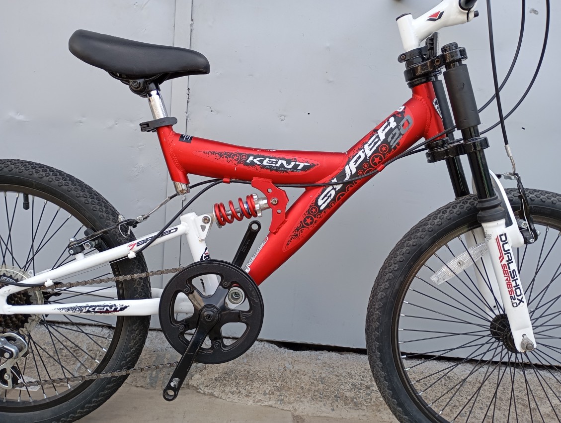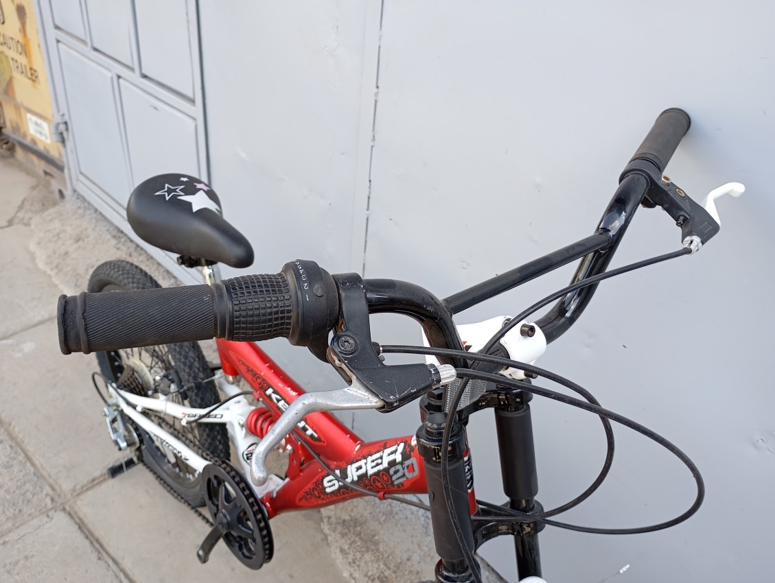High quality used mountain bike. Wheel size 20. Frame material aluminium. Gear system 1x7 speed with grip shifters. Cog type freewheel. Other features: Dual suspension with steel suspension fork. Suitable for ages 6-11 years.