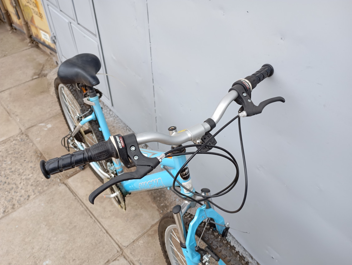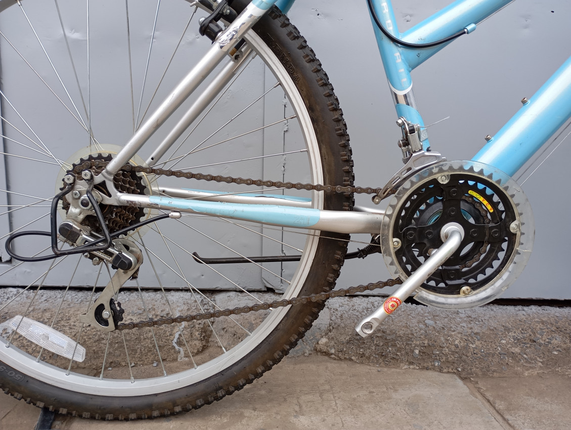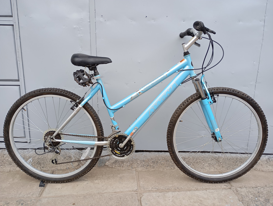 High quality used mountain bike. Wheel size 26. Frame material steel with steel front suspension fork. Top tube 22', seat tube height 18'. Gear system 3x7 with grip shift. Cog type freewheel.