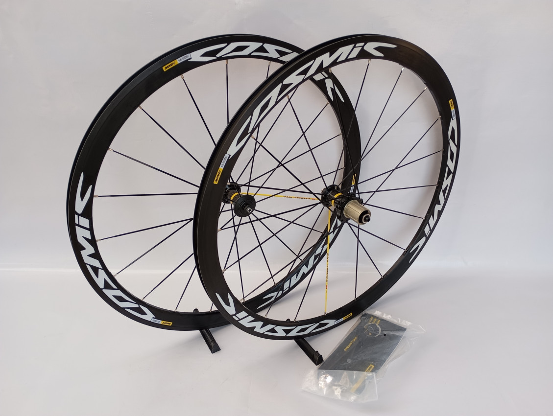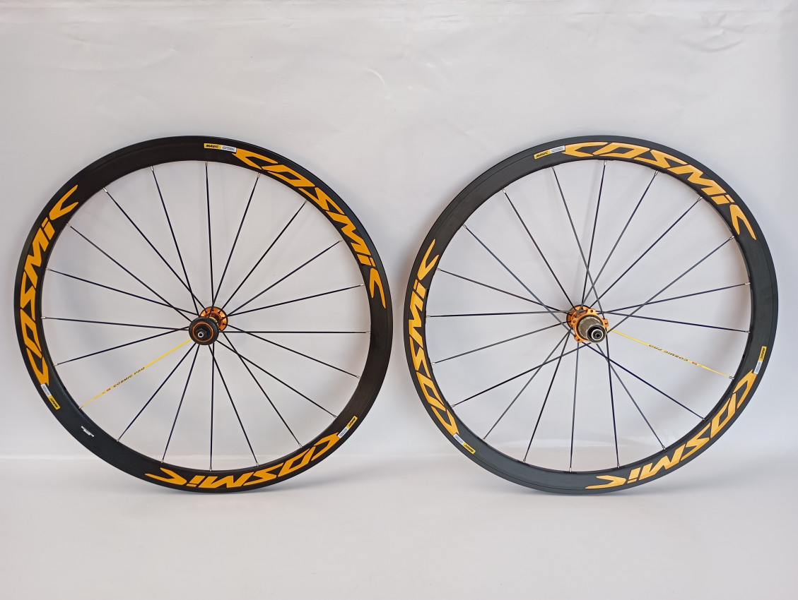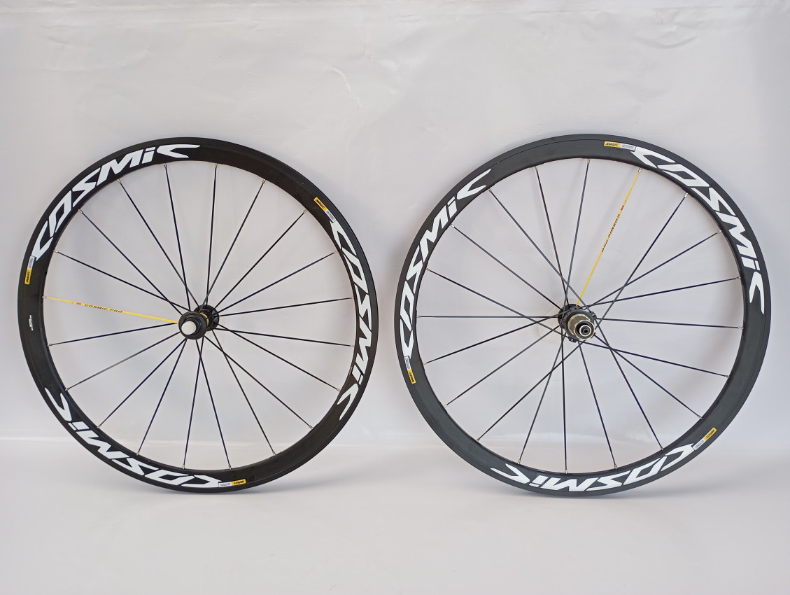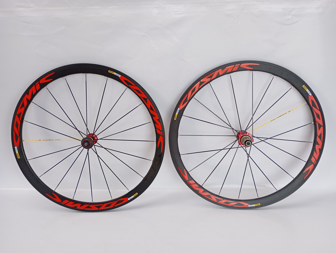 700c alloy rim set 40mm F 20 holes R24 holes. Alloy rim and carbon hubs sealed bearings. Quick release type. Rim brake compatible.  Brand, Mavic Cosmic