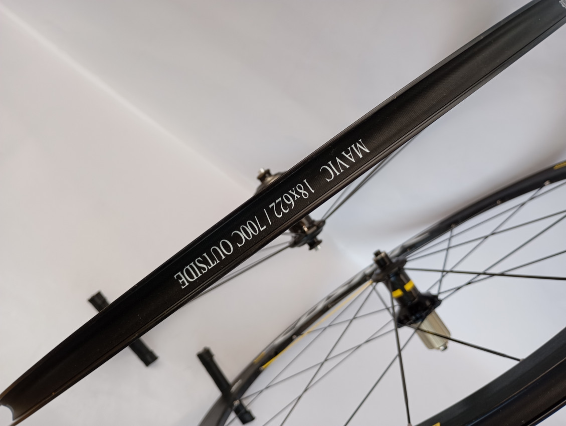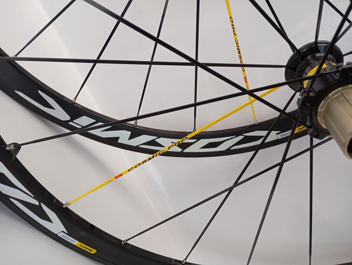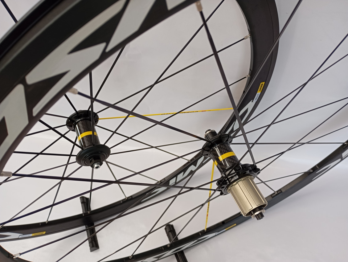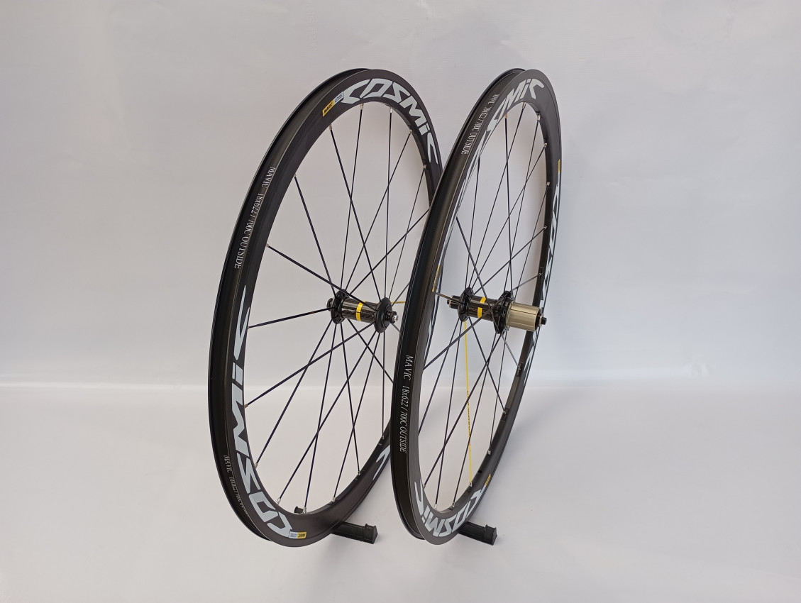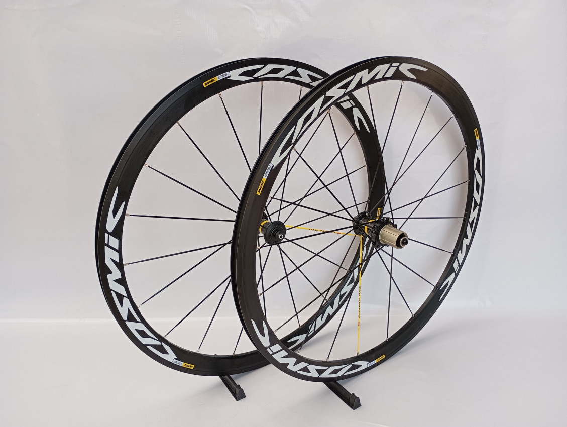 700c alloy rim set 40mm F 20 holes R24 holes. Alloy rim and carbon hubs sealed bearings. Quick release type. Rim brake compatible.  Brand, Mavic Cosmic