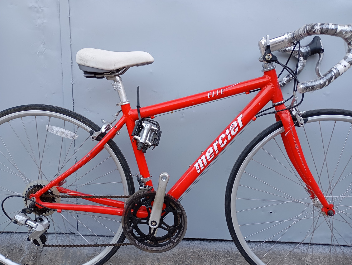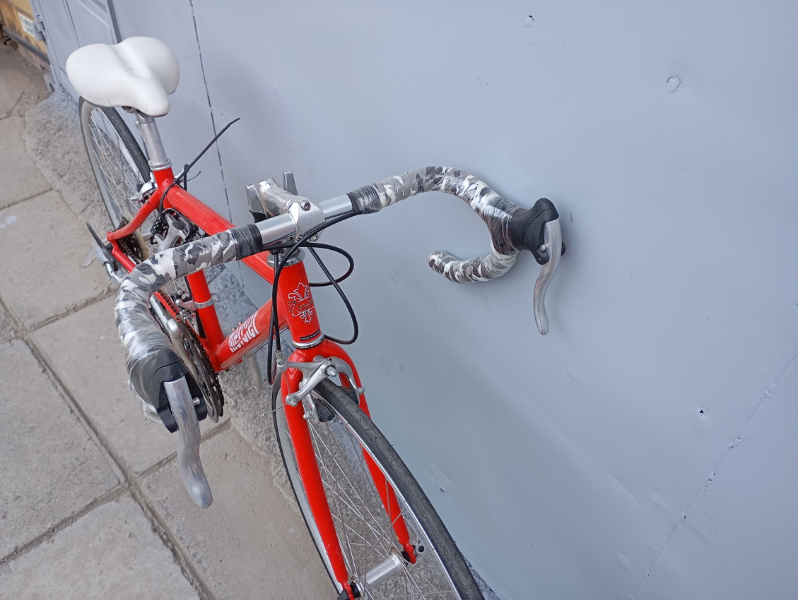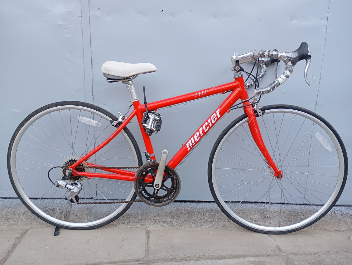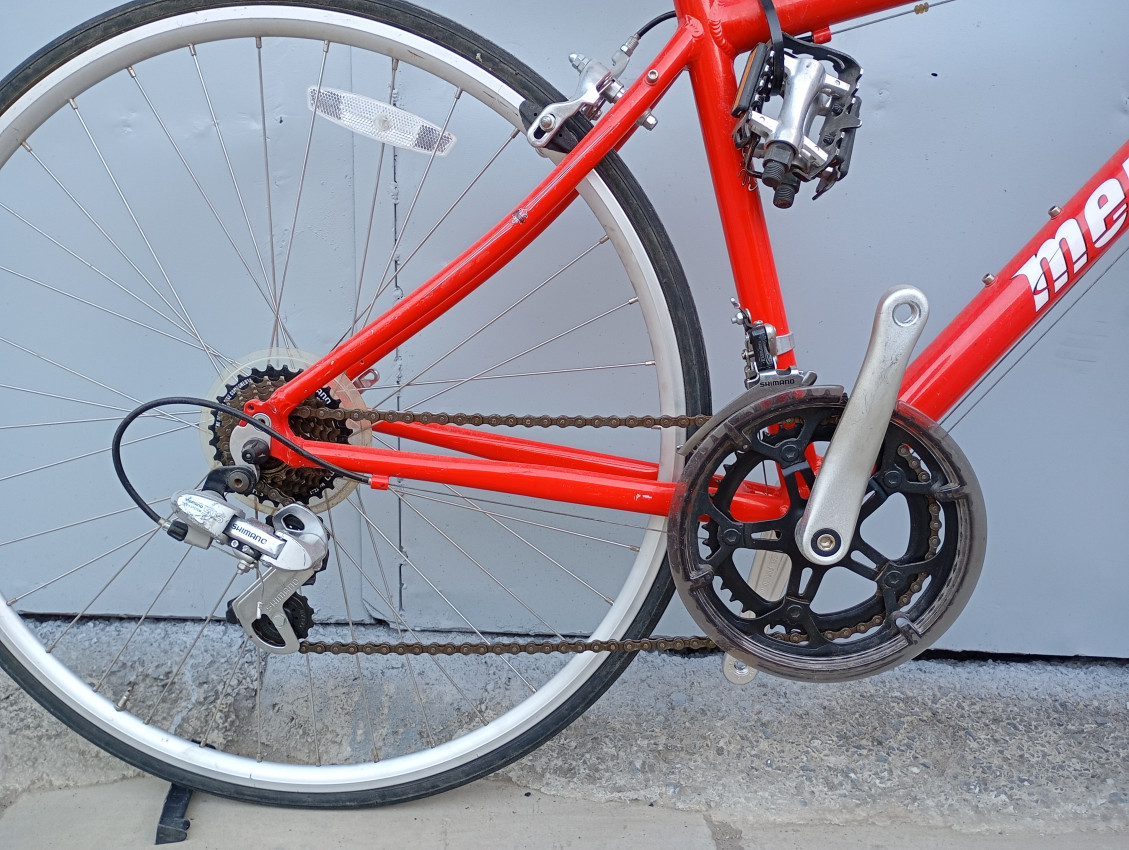 High quality used race bike. Wheel size 700c. Frame material Aluminium with steel fork.Top tube 50cm, seat tube height 42.5cm . Gear system 2x7 with shimano thumb shifters. Cog type freewheel. Other features: sealed BB, all wheels have quick release, steel fork.
