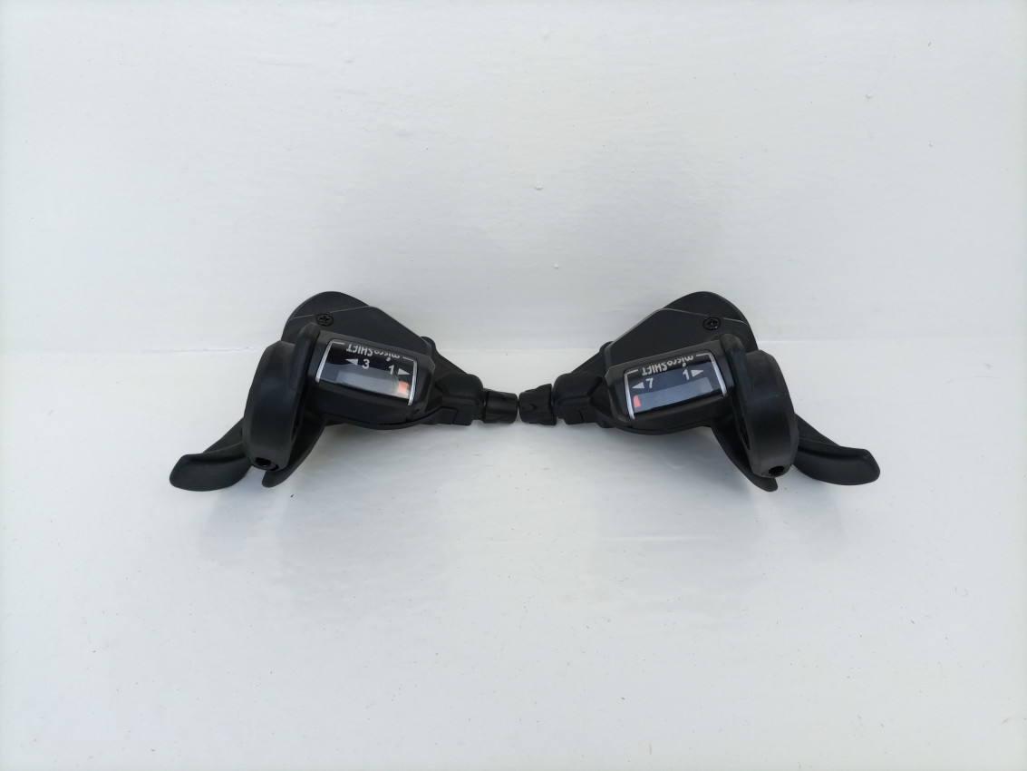 Top quality 3x7 speed gear shifters. Brand Microshift, Shimano compatible. Comes with gear cables