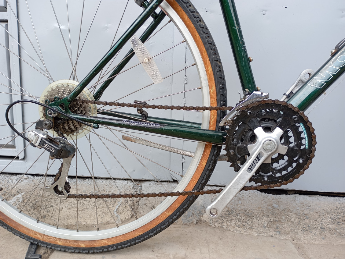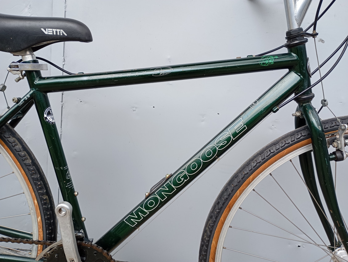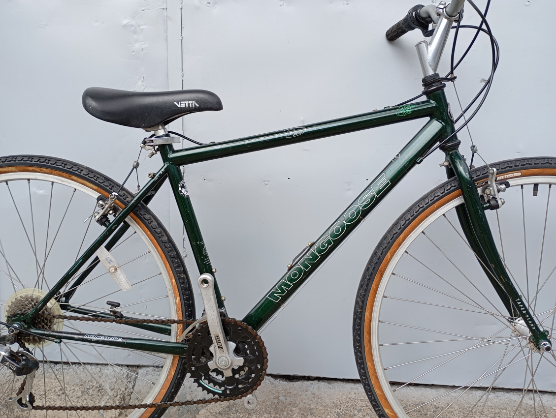 High quality used hybrid bike. Wheel size 700c. Frame material steel.Top tube 21.5', seat tube height 18'. Gear system 3x7 with shimano grip shift. Cog type freewheel. Other features: all wheels have quick release.