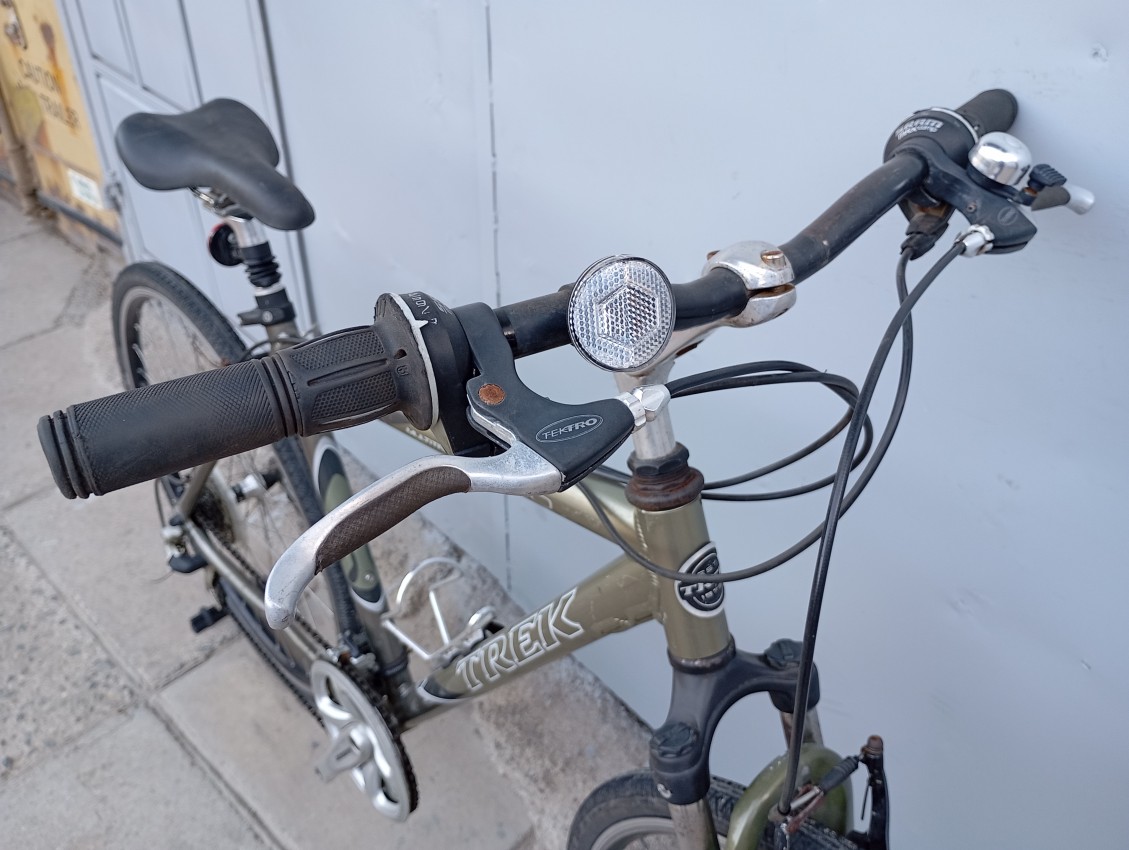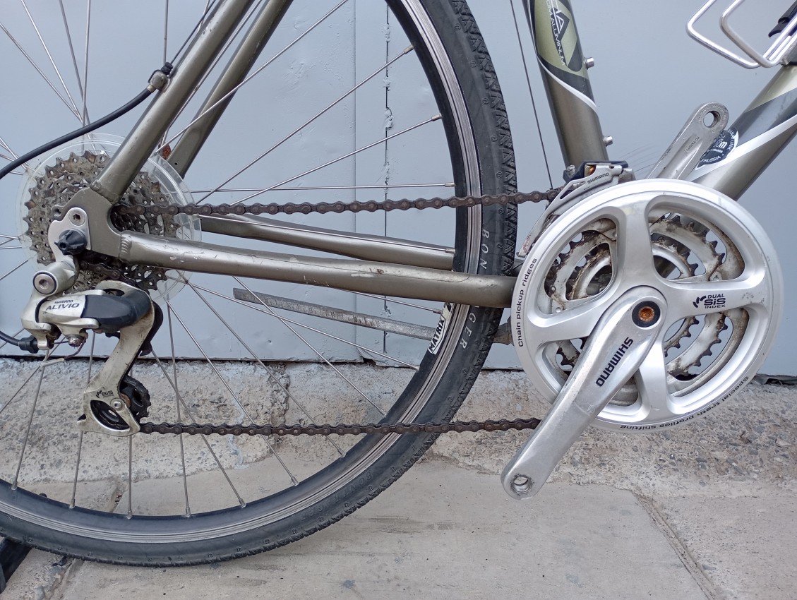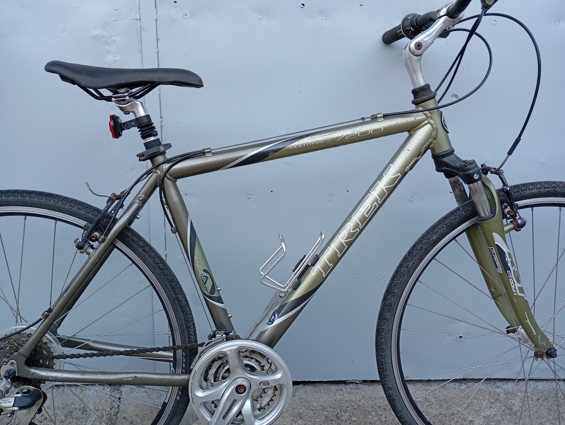 High quality used hybrid bike. Wheel size 700c. Frame material Aluminium with aluminium fork. Top tube 21.5', seat tube height 20'. Gear system 3x7 with grip shifts. Cog type cassette. Other features: sealed BB, alloy suspension fork, all wheels have quick release.