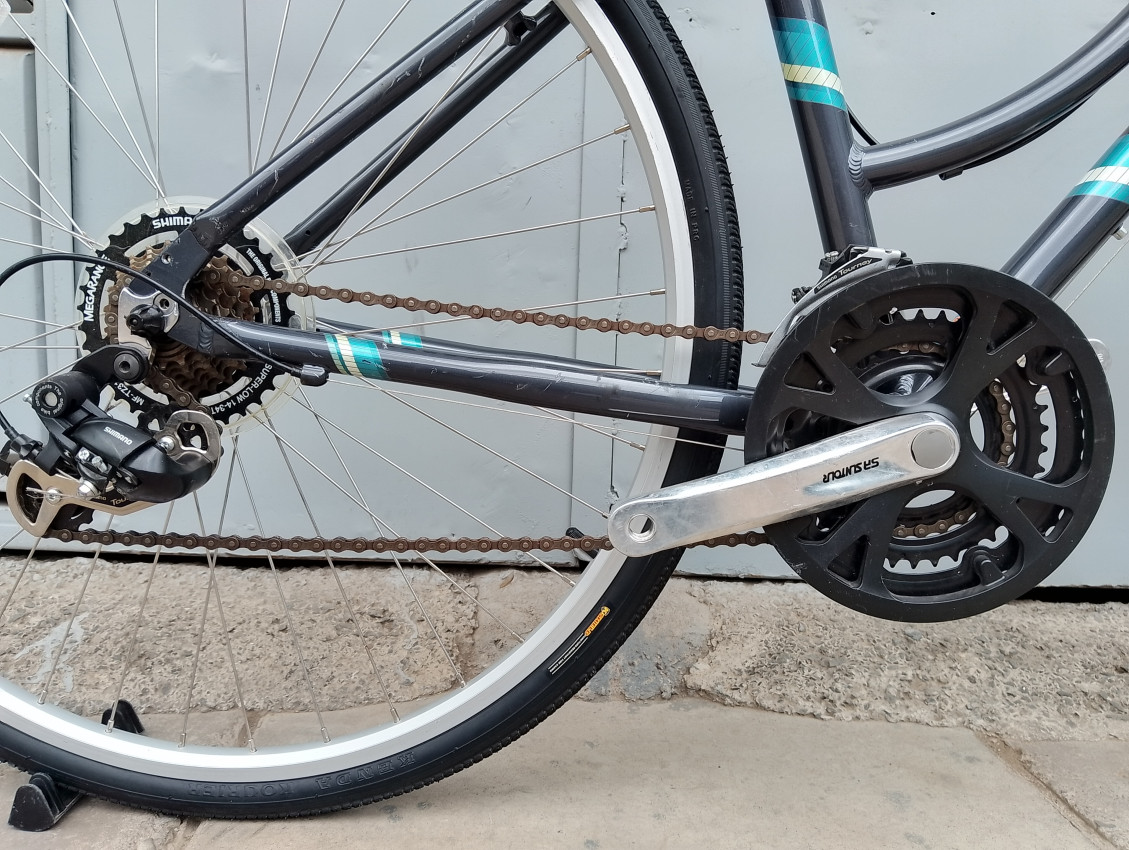 High quality used hybrid bike. Wheel size 700c. Frame material Aluminium with steel fork. Top tube 21', seat tube height 17.5'. Gear system 3x7 with shimano grip shifts. Cog type freewheel. Other features: sealed BB all wheels have quick release.