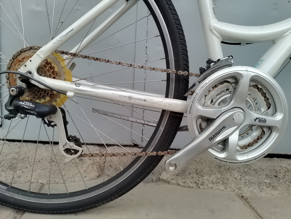 High quality used hybrid bike. Wheel size 700c. Frame material Aluminium with aluminium fork. Top tube 21', seat tube height 17.5'. Gear system 3x8 with trigger shift brake levers . Cog type cassette. Other features: sealed BB all wheels have quick release.