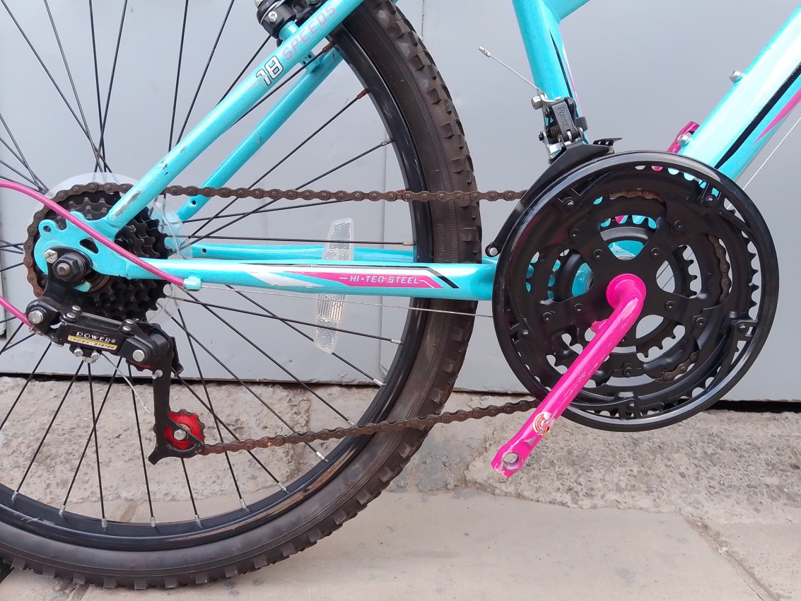 High quality used mountain bike. Wheel size 24 Frame material steel. Gear system 3x6 speed with grip shifters. Cog type freewheel. Other features: front suspension fork.