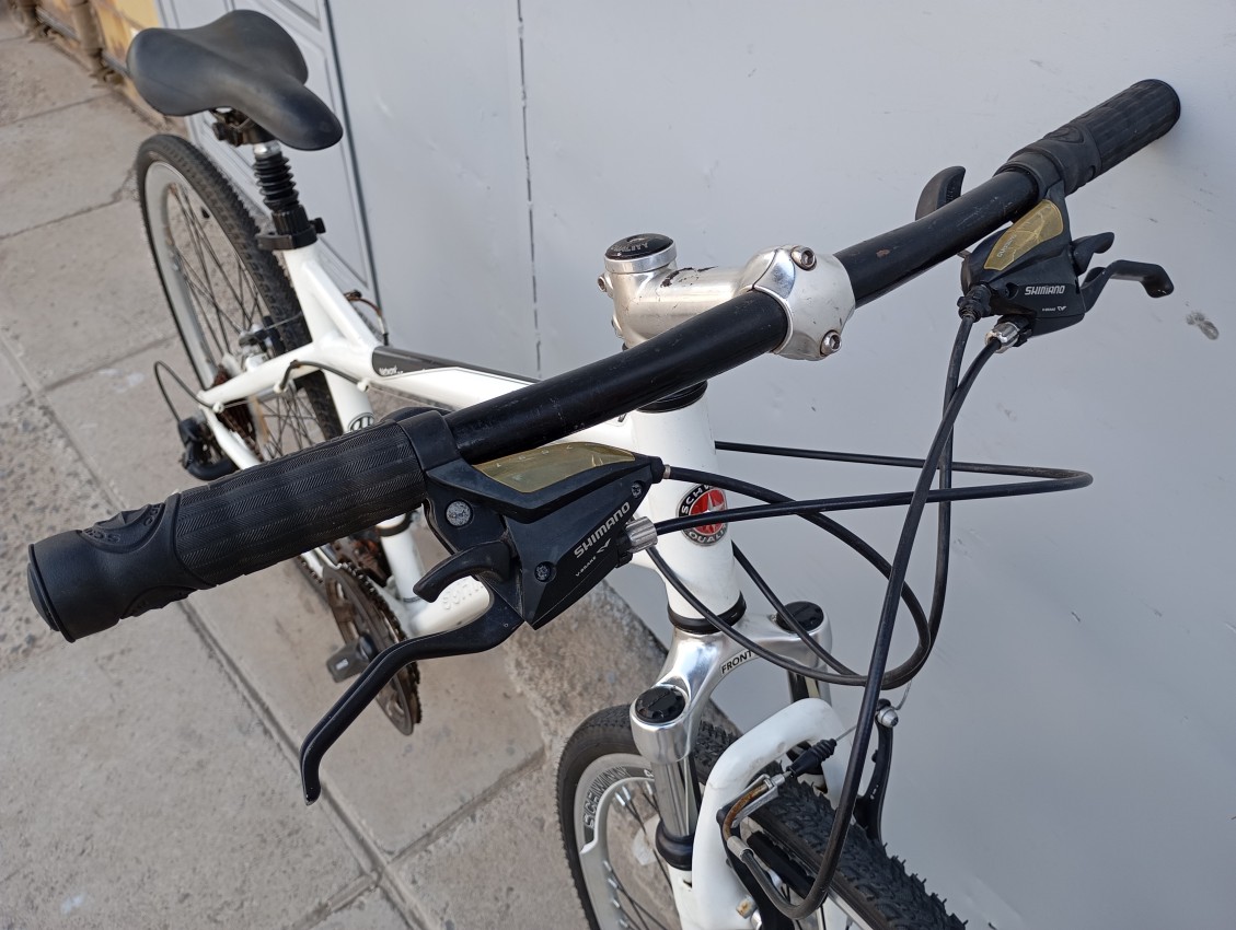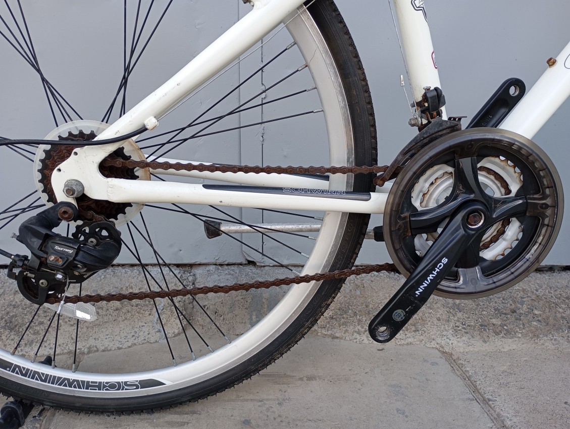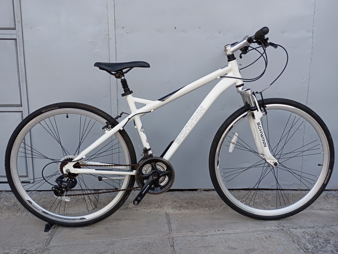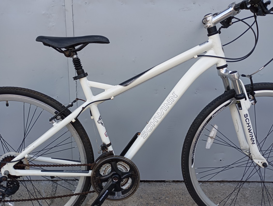 High quality used hybrid bike. Wheel size 700c. Frame material Aluminium with steel fork. Top tube 22.5', seat tube height 18'. Gear system 3x7 with trigger shifts. Cog type freewheel. Other features: steel suspension fork, front wheel quick release.