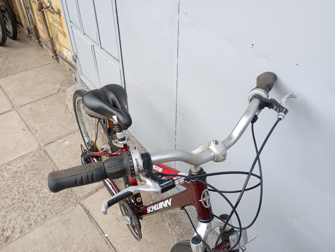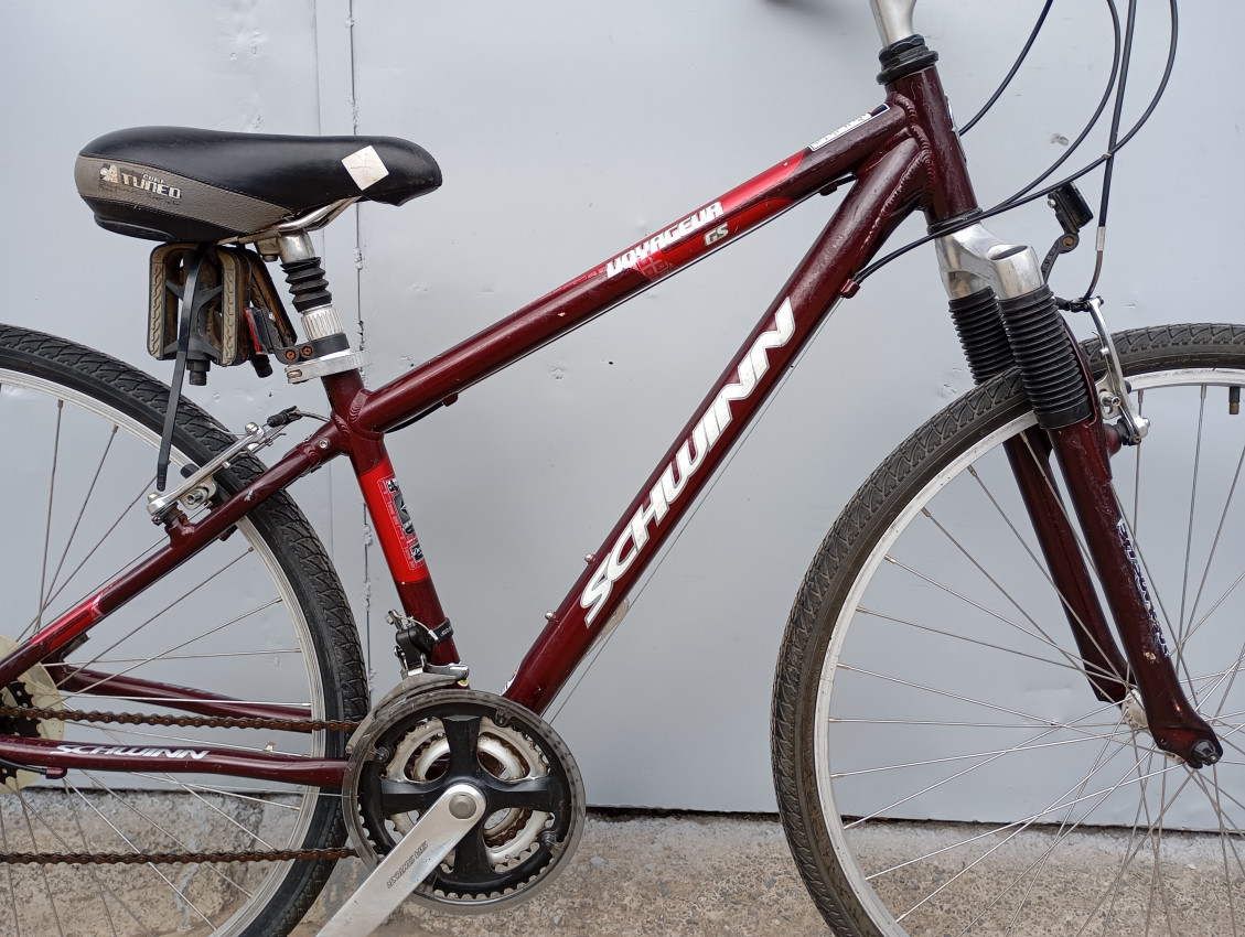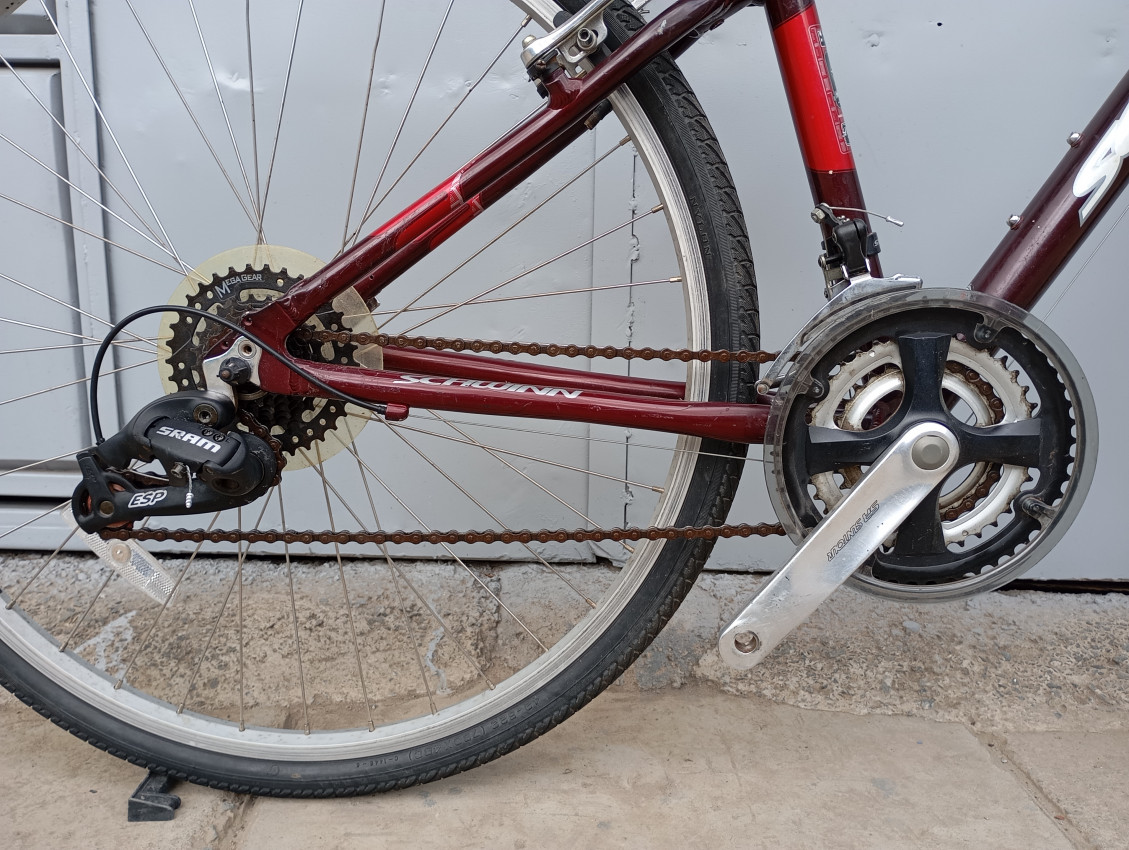 High quality used hybrid bike. Wheel size 700c. Frame material Aluminium with steel fork. Top tube 21', seat tube height 15'. Gear system 3x7 with grip shifts. Cog type freewheel. Other features: all wheels have quick release & front suspension fork.