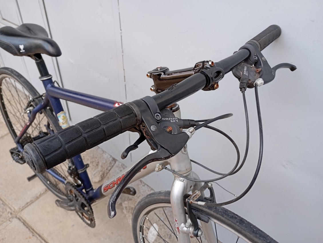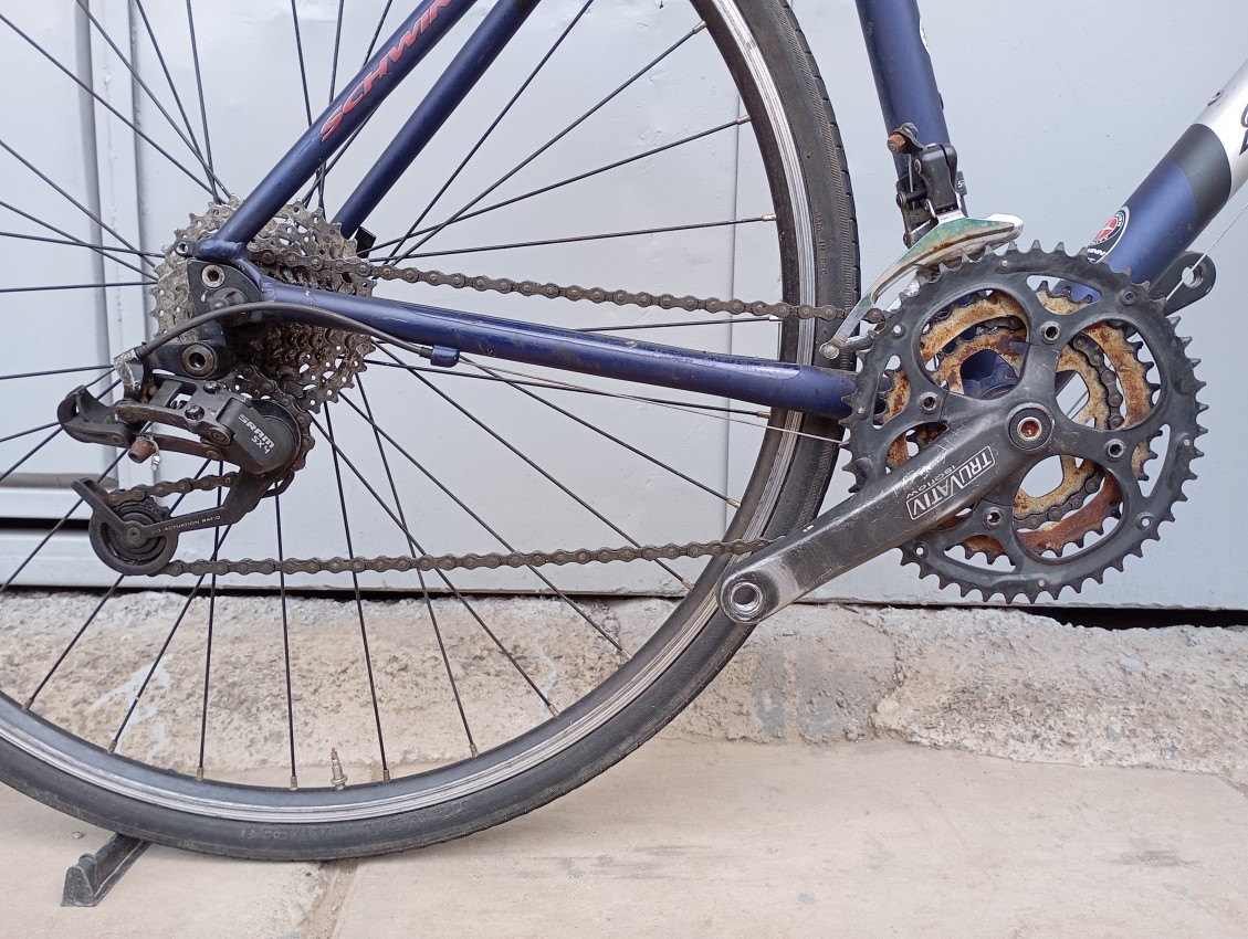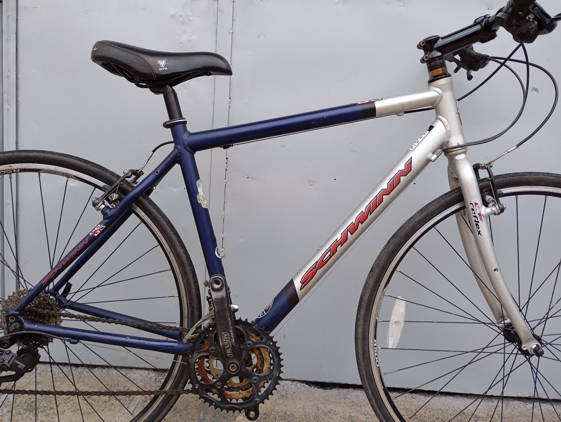 High quality used hybrid bike. Wheel size 700c. Frame material Aluminium with aluminium rigid fork. Top tube 21', seat tube height 19.5'. Gear system 3x8 with sram SX4 trigger shifts. Cog type cassette. Other features: sealed BB all wheels have quick release.