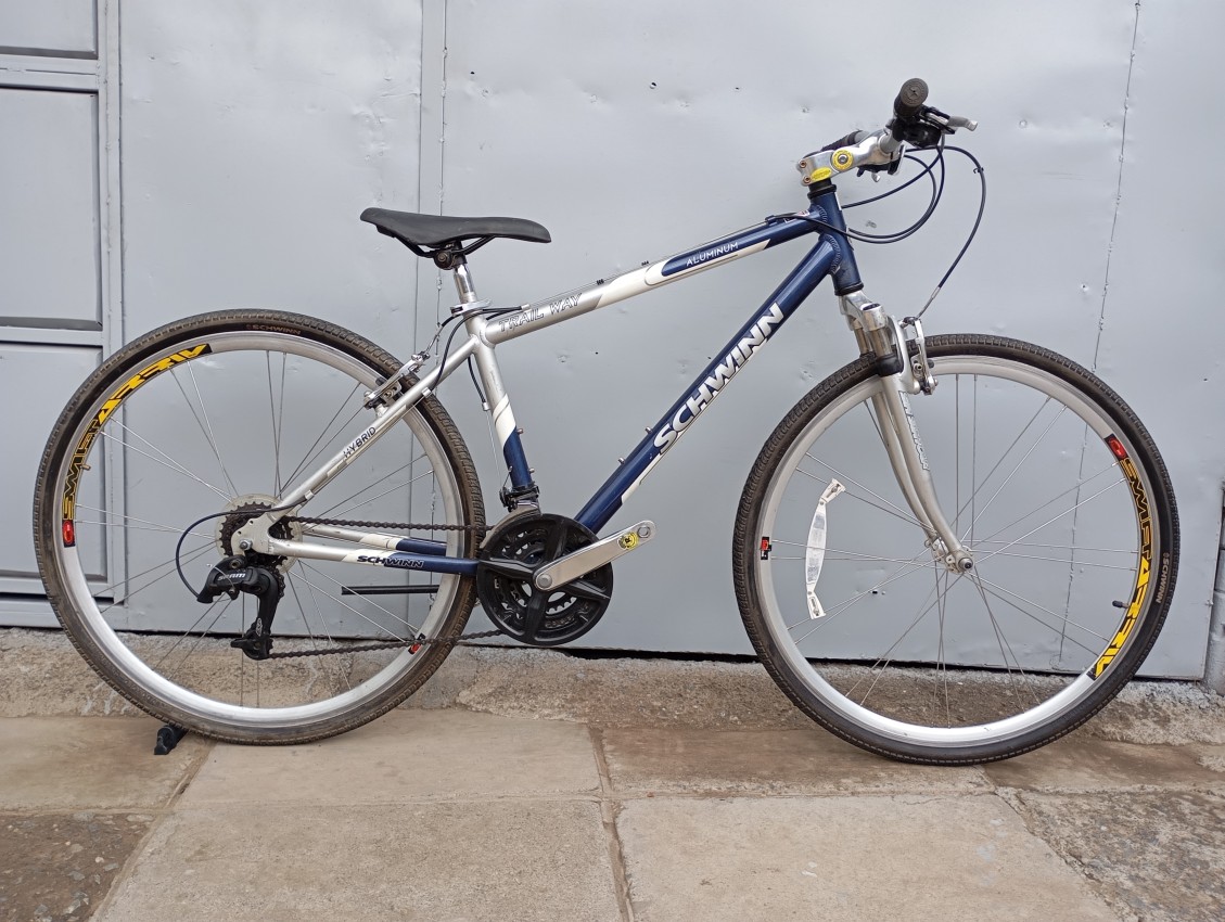 High quality used hybrid bike. Wheel size 700c. Frame material Aluminium with aluminium suspension fork. Top tube 22.5', seat tube height 17'. Gear system 3x7 with sram trigger shifts. Cog type freewheel. Other features: sealed BB all wheels have quick release & front alloy suspension fork.