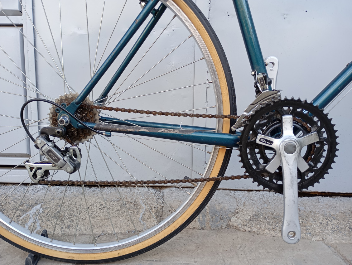 High quality used hybrid bike. Wheel size 700c. Frame material steel.Top tube 22.5', seat tube height 19.5'. Gear system 3x6 with grip shifts. Cog type freewheel. Other features: all wheels have quick release.