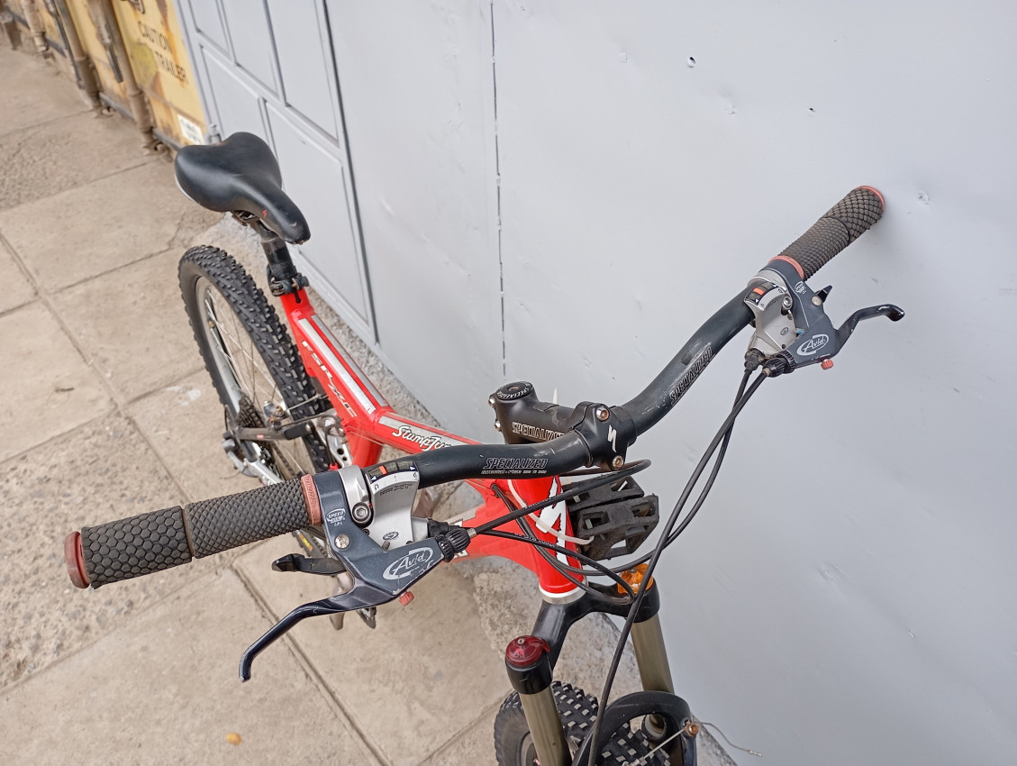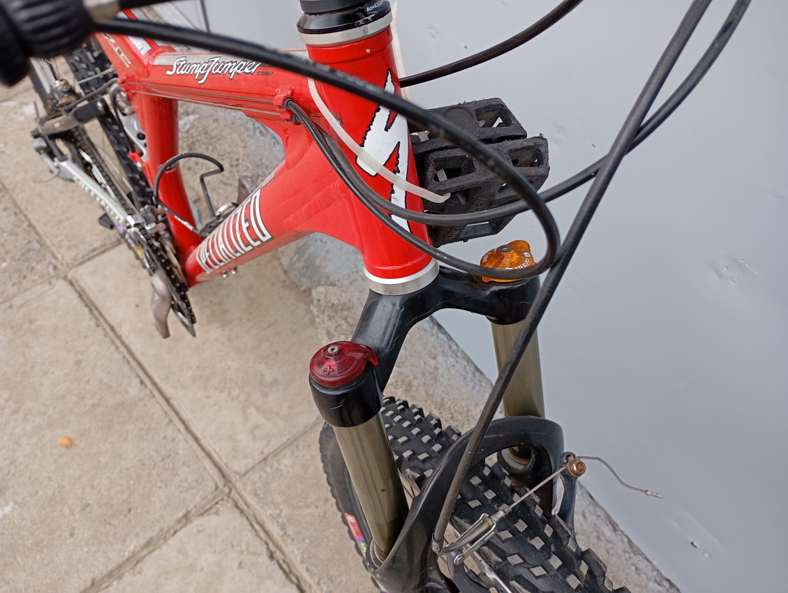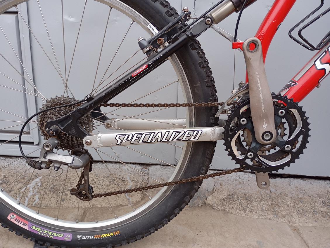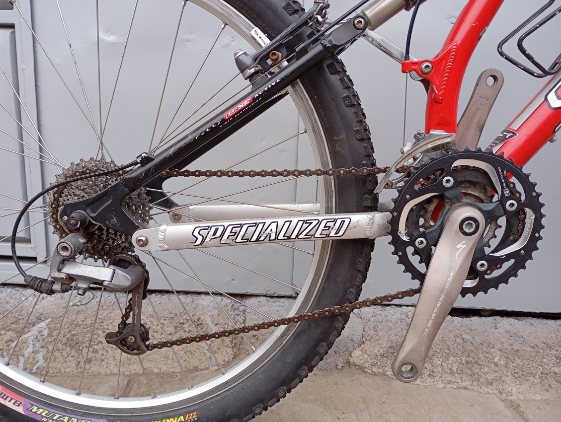 High quality used mountain bike. Wheel size 26. Frame material Aluminium with aluminium front and rear suspensions. Top tube 22', seat tube height 19'. Gear system 3x9 with shimano trigger shifter. Cog type cassette Other features: sealed BB all wheels have quick release, rear suspension, air type. threadless alloy suspension fork.