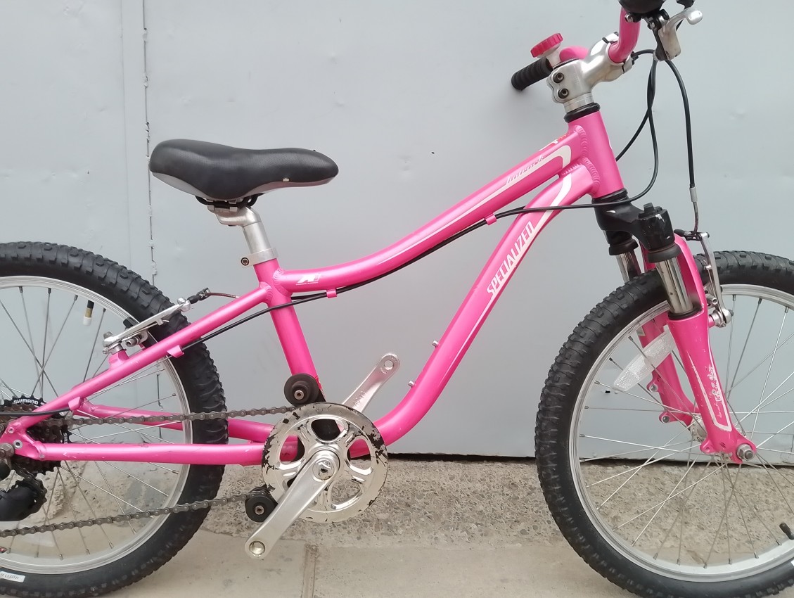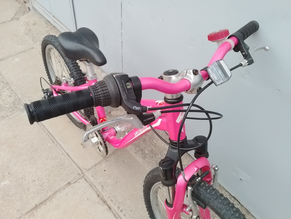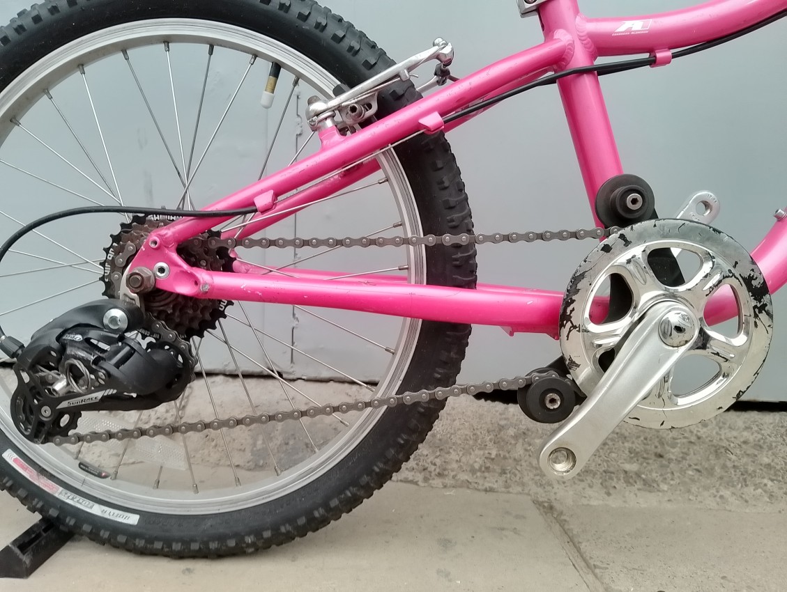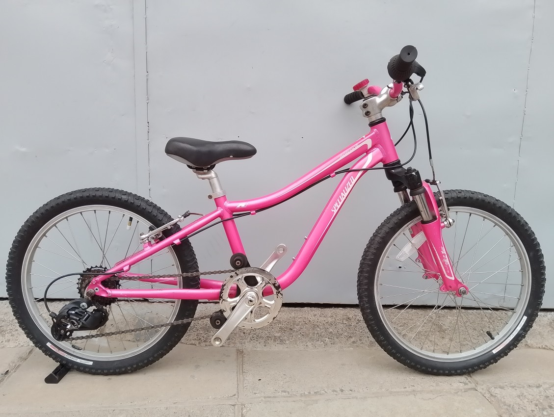 High quality used mountain bike. Wheel size 20 Frame material aluminium. Gear system 1x6 speed with shimano grip shifters. Cog type freewheel. Other features: threadless alloy suspension fork. Suitable for ages 6-11 years.