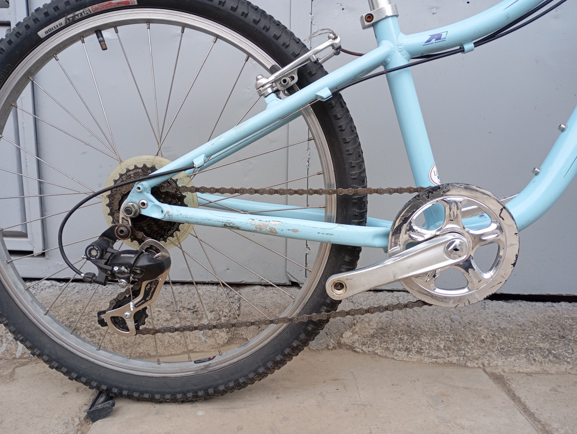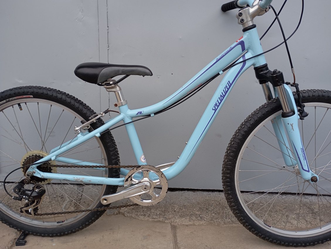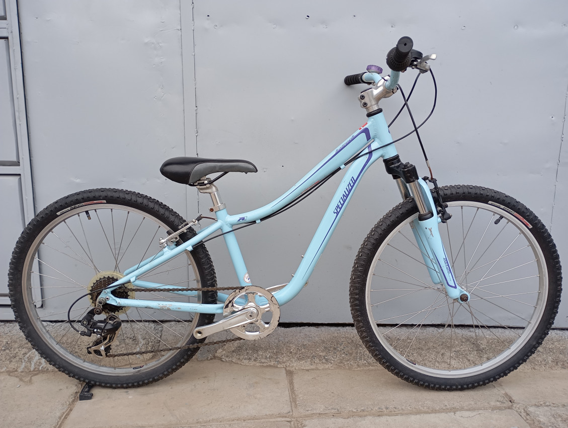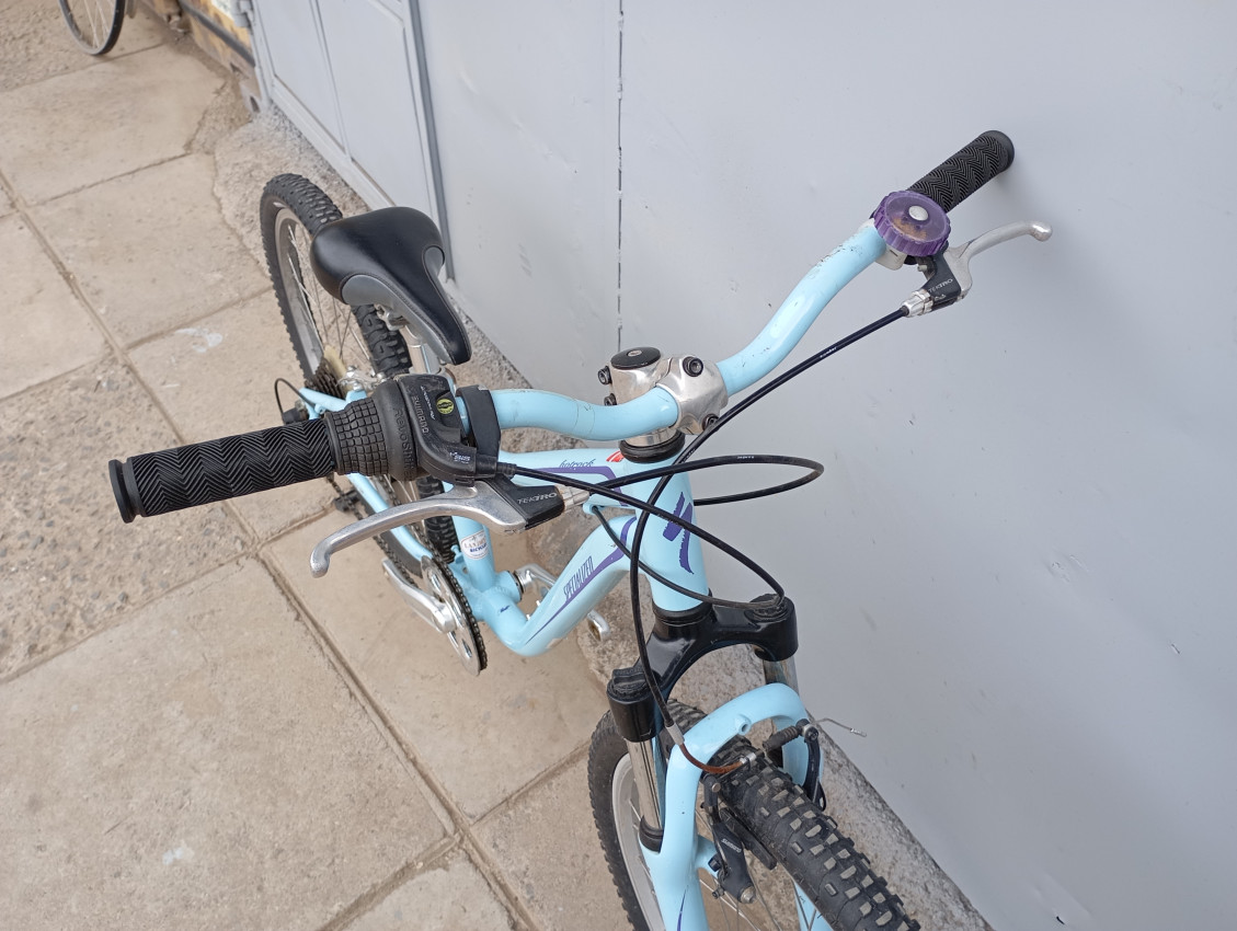 High quality used mountain bike. Wheel size 24 Frame material aluminium. Gear system 1x7 speed with grip shifters. Cog type freewheel. Other features: threadless alloy suspension fork.