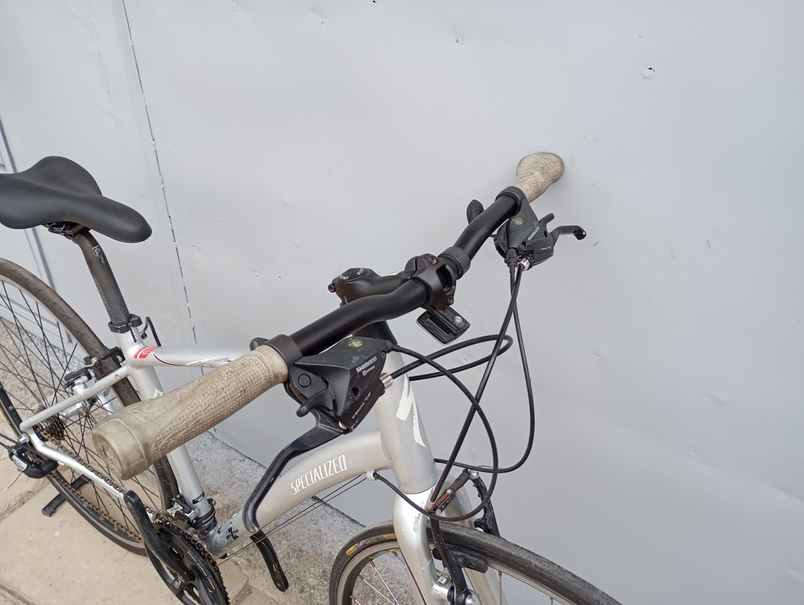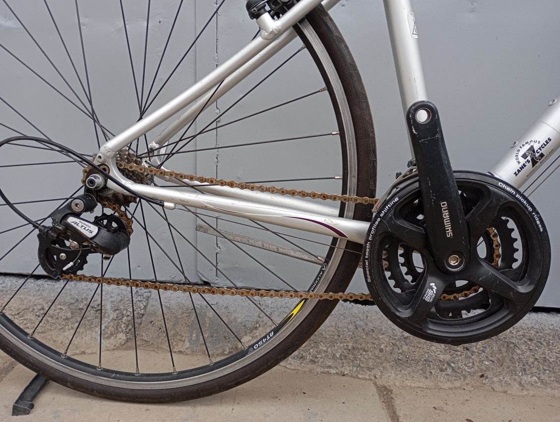 High quality used hybrid bike. Wheel size 700c. Frame material Aluminium with aluminium fork. Top tube 20', seat tube height 17.5'. Gear system 3x8 with shimano trigger shift brake levers. Cog type cassette. Other features: sealed BB all wheels have quick release.