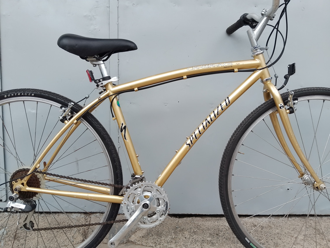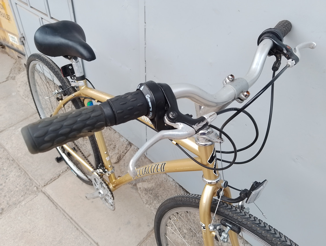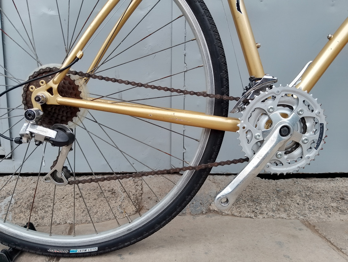 High quality used hybrid bike. Wheel size 700c. Frame material steel.Top tube 21.5', seat tube height 18'. Gear system 3x7 with grip shifts. Cog type cassettee. Other features: all wheels have quick release.