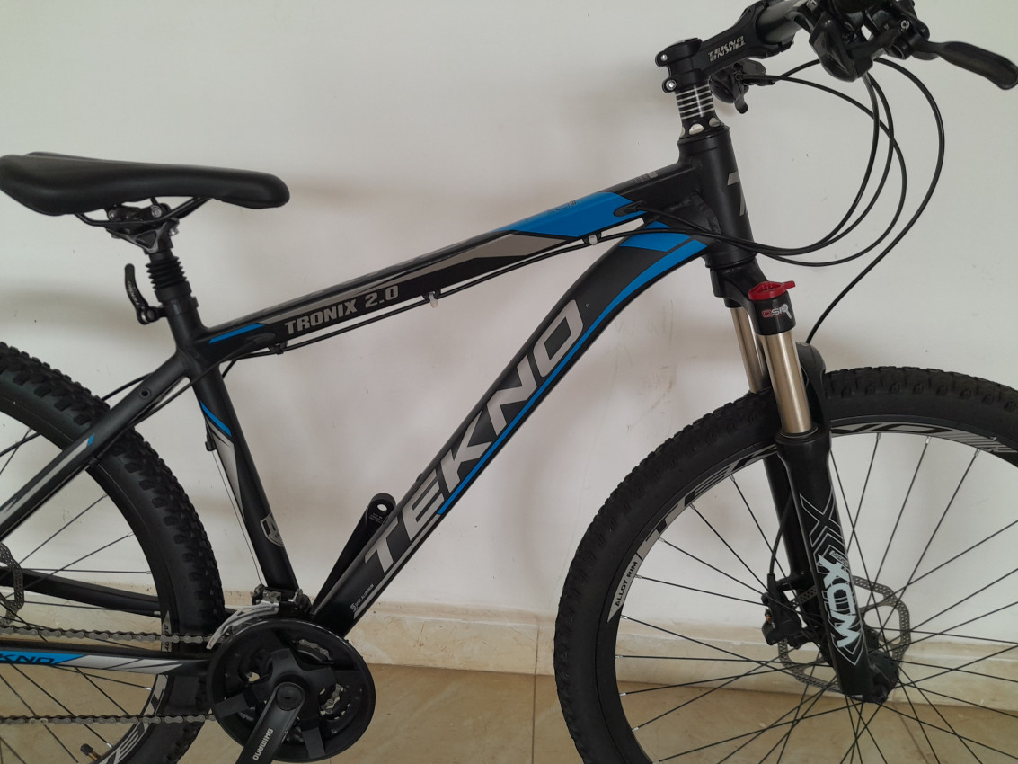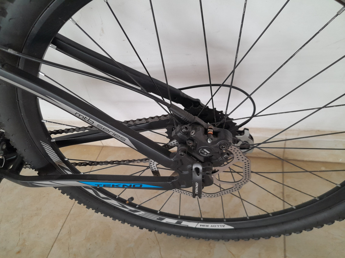 Brand new  MTB, wheel size 27.5, brand Tekno. Frame material  Aluminium with front suspension. Frame size top tube 22' seat tube height 16.5'. Speed 3x8 with trigger shifters, cog cassette. Other features include sealed bb and all wheels have quick release.