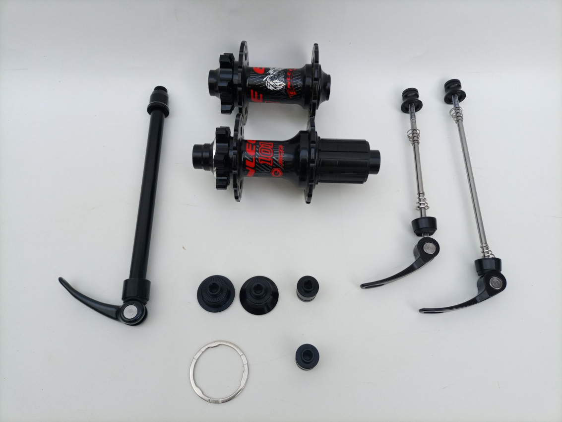 Band new alloy through axle sealed bering hubs comes With conversion adapters to standard Qr system (skewer). Compatible with 10-12 speed drive trains.