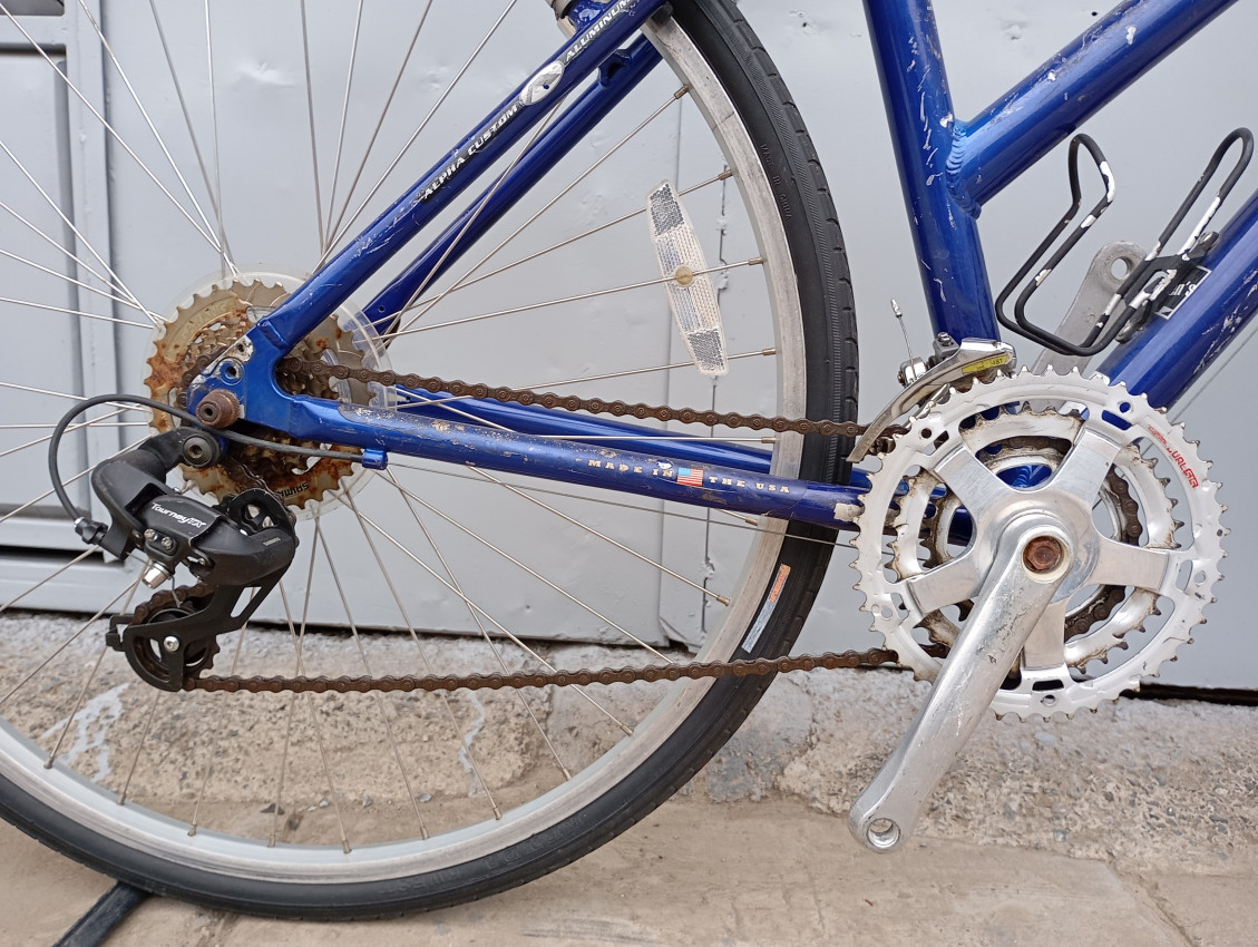 High quality used hybrid bike. Wheel size 700c. Frame material Aluminium with steel fork. Top tube 21', seat tube height 17.5'. Gear system 3x7 with grip shift . Cog type freewheel. Other features: sealed BB all wheels have quick release.