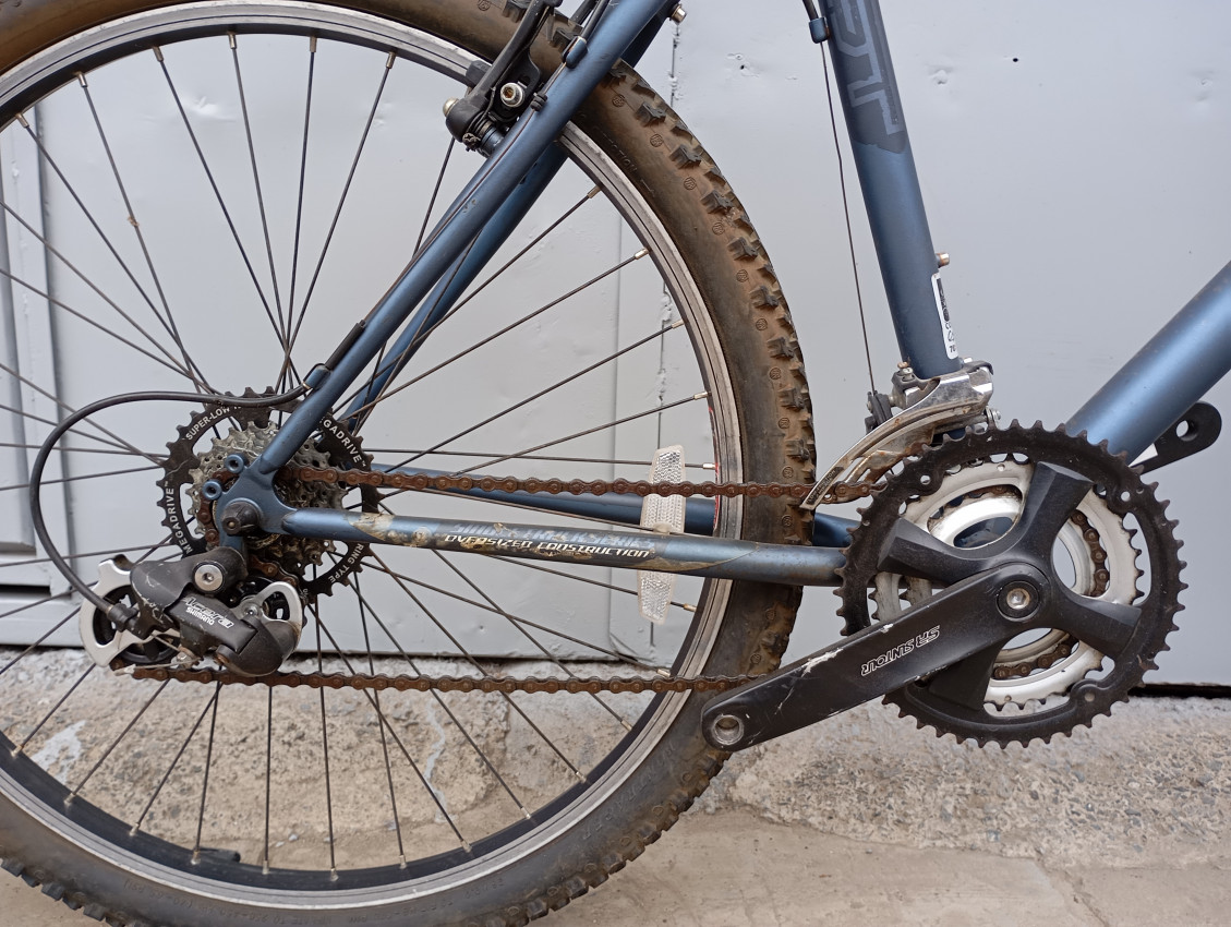 High quality used mountain bike. Wheel size 26. Frame material steel with steel suspension fork. Top tube 22.5', seat tube height 19.5'. Gear system 3x7 with Shimano trigger shift. Cog type frewheel. Quick release on both wheels, sealed BB.
