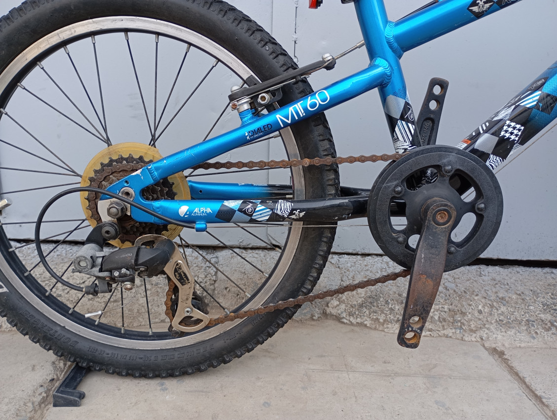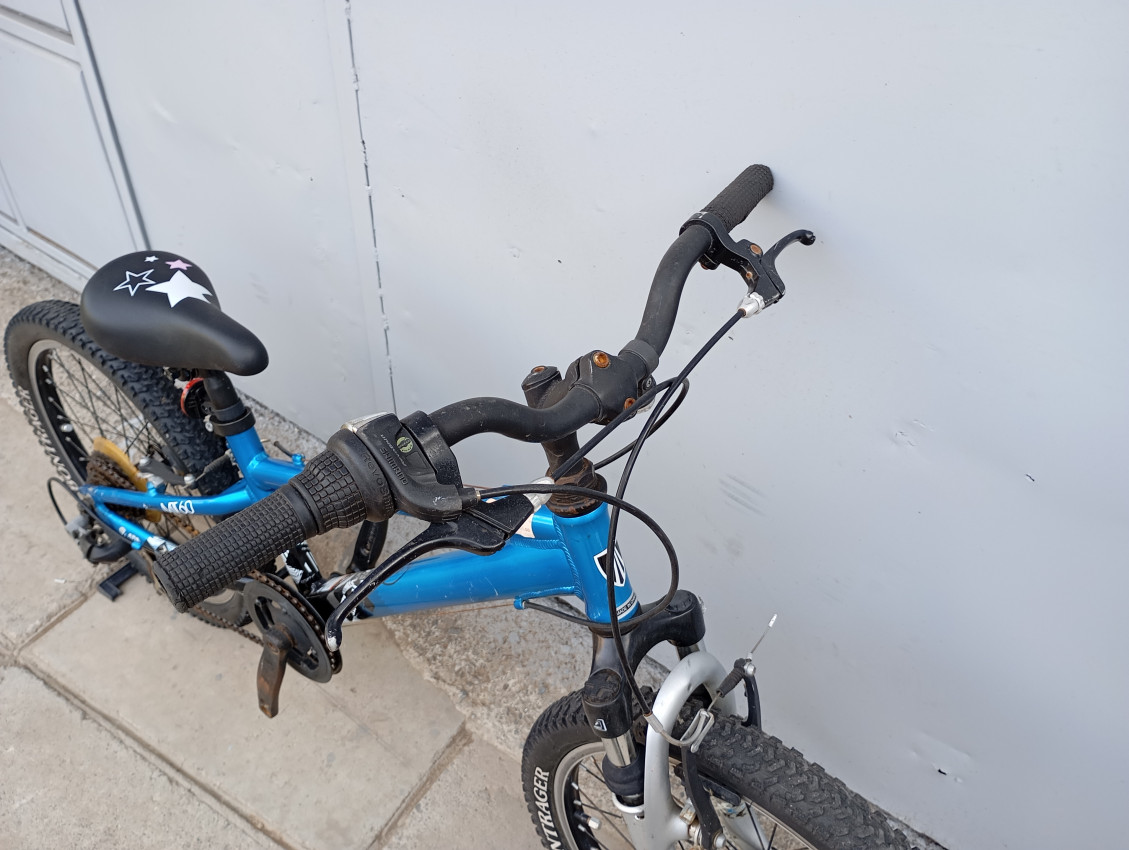High quality used mountain bike. Wheel size 20 Frame material aluminium. Gear system 1x7 speed with grip shifters. Cog type freewheel. Other features: threaded suspension fork, Suitable for ages 6-11 years.