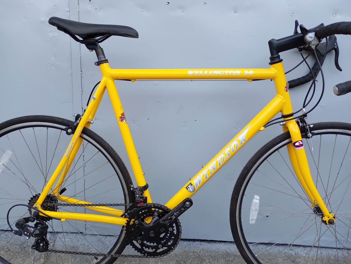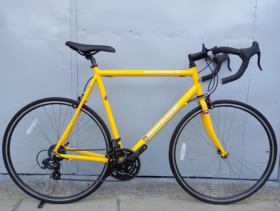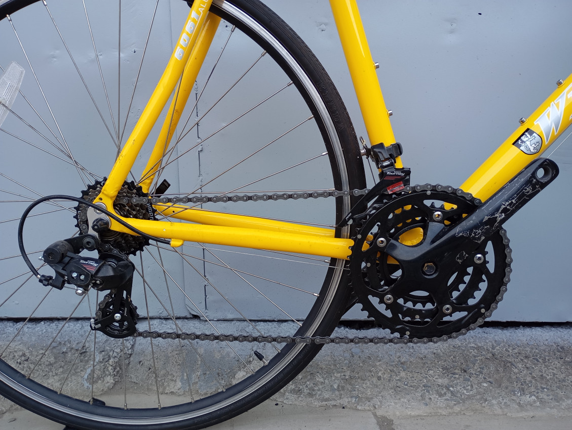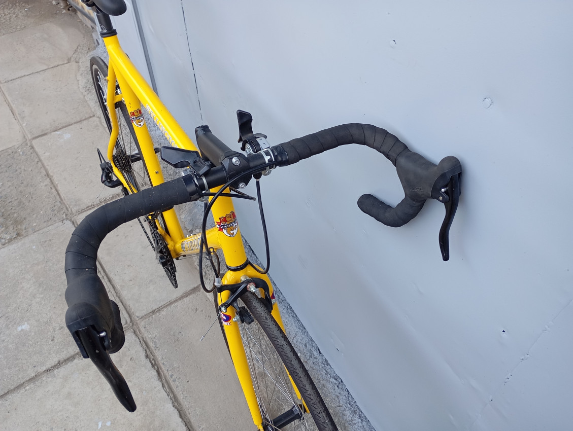 High quality used race bike. Wheel size 700c. Frame material Aluminium with steel fork.Top tube 58.5cm, seat tube height 62cm . Gear system 3x7 with shimano thumb shifters. Cog type freewheel. Other features: sealed BB all wheels have quick release. steel fork.